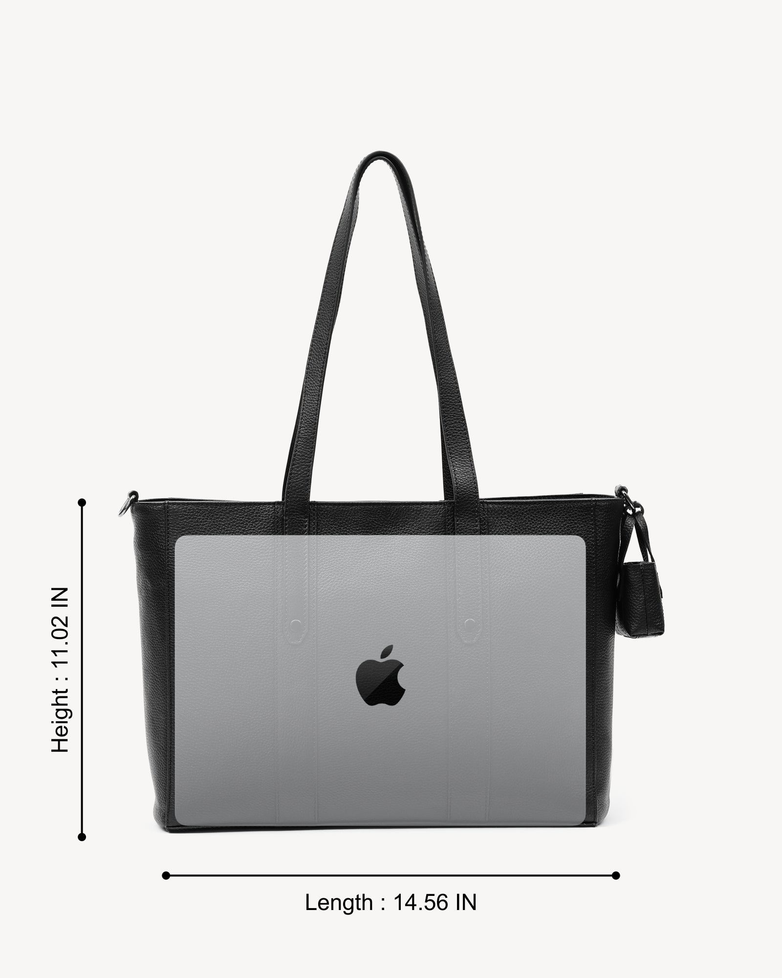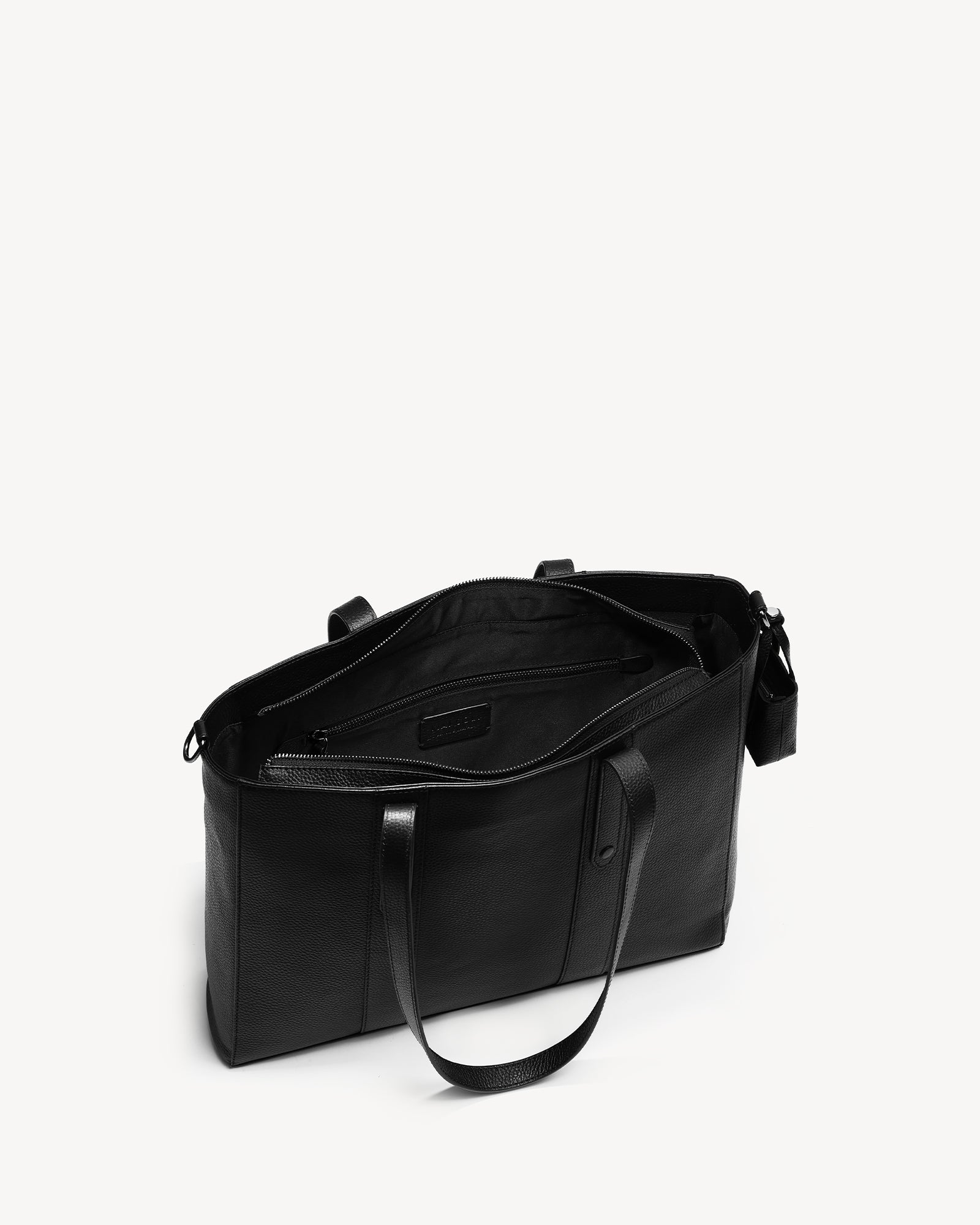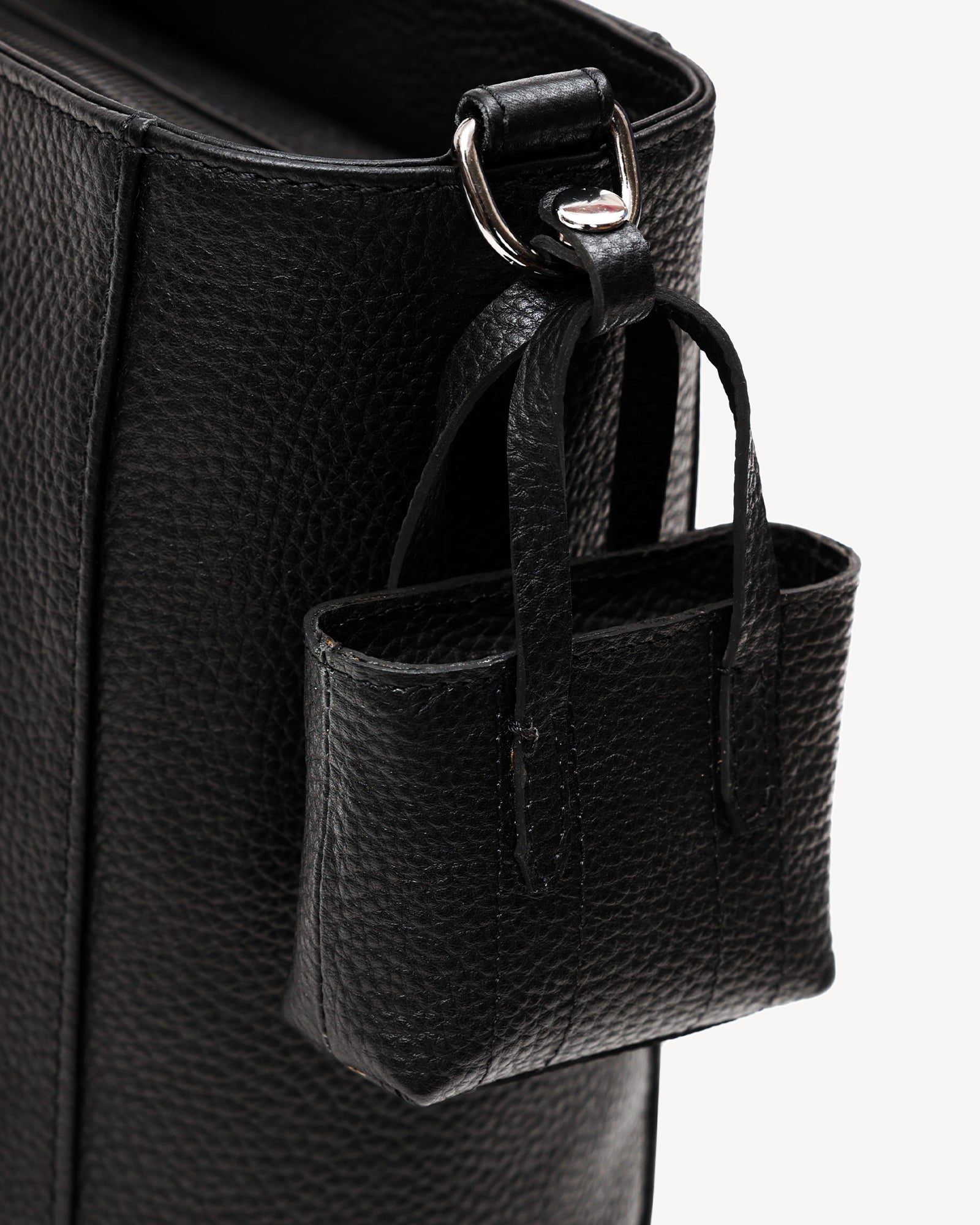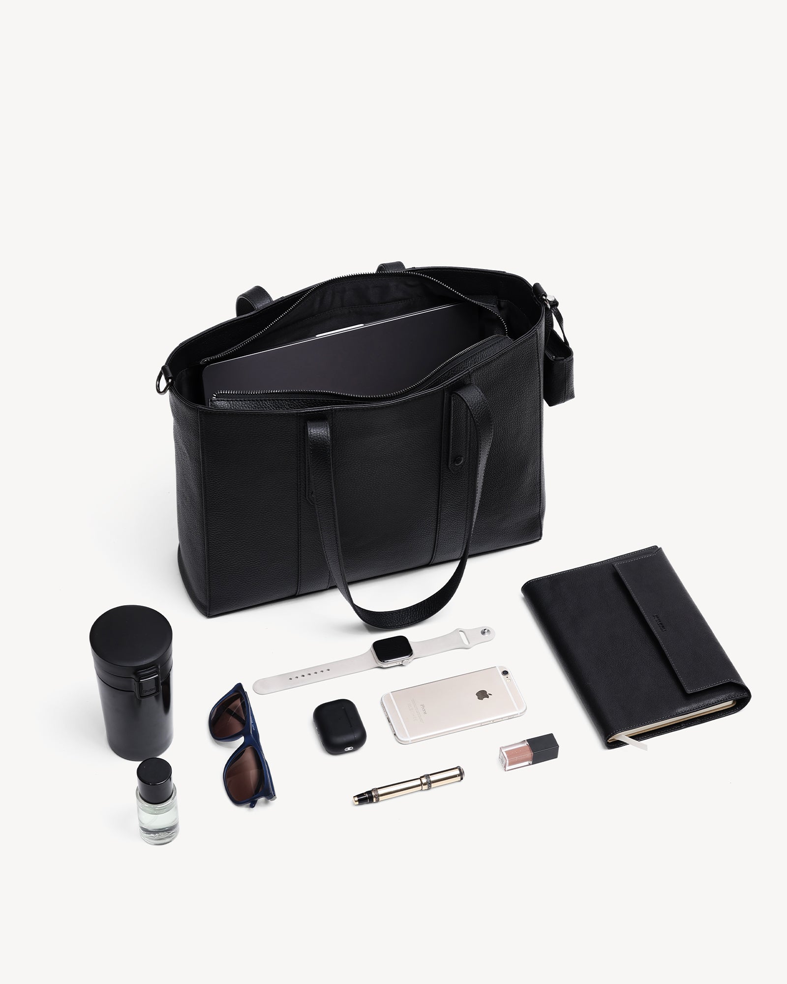 Redefining the art of everyday carry. Crafted from full-grain pebbled leather and accented with sleek gunmetal hardware, this bag merges understated luxury with intelligent design. Supple leather zipper pullers open to a spacious main compartment that accommodates up to a 16" laptop with ease. Inside, a zip pocket secures your valuables, while a slip pocket keeps daily essentials within quick reach. A complimentary mini pouch for your EarPods adds a refined touch of convenience. Effortless elegance, built to keep pace with modern life.