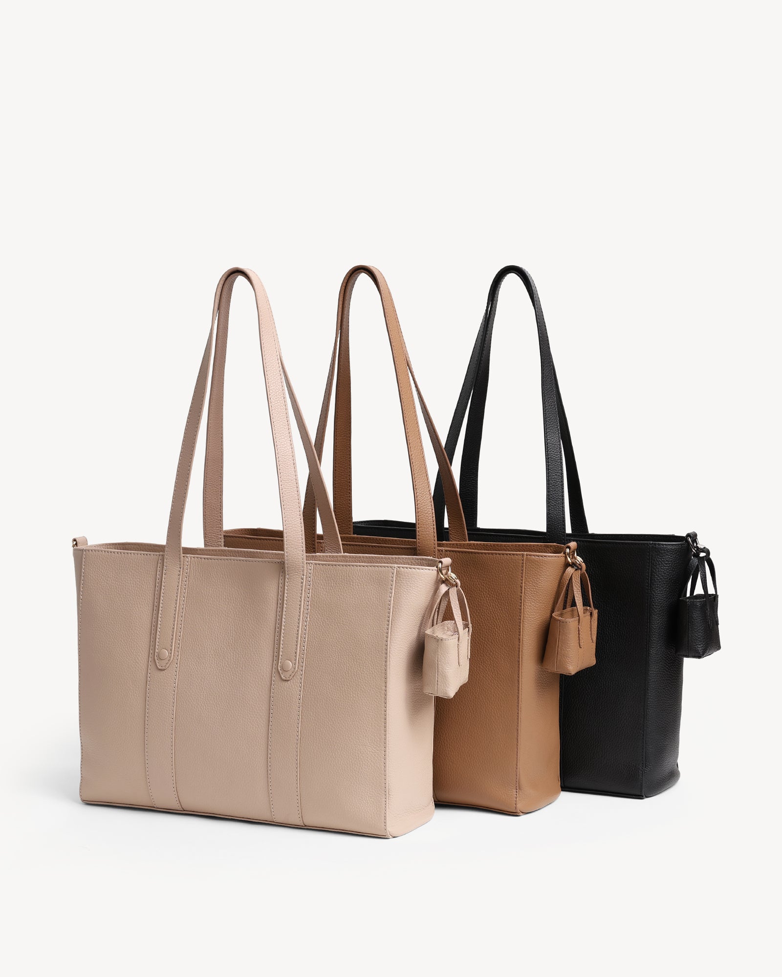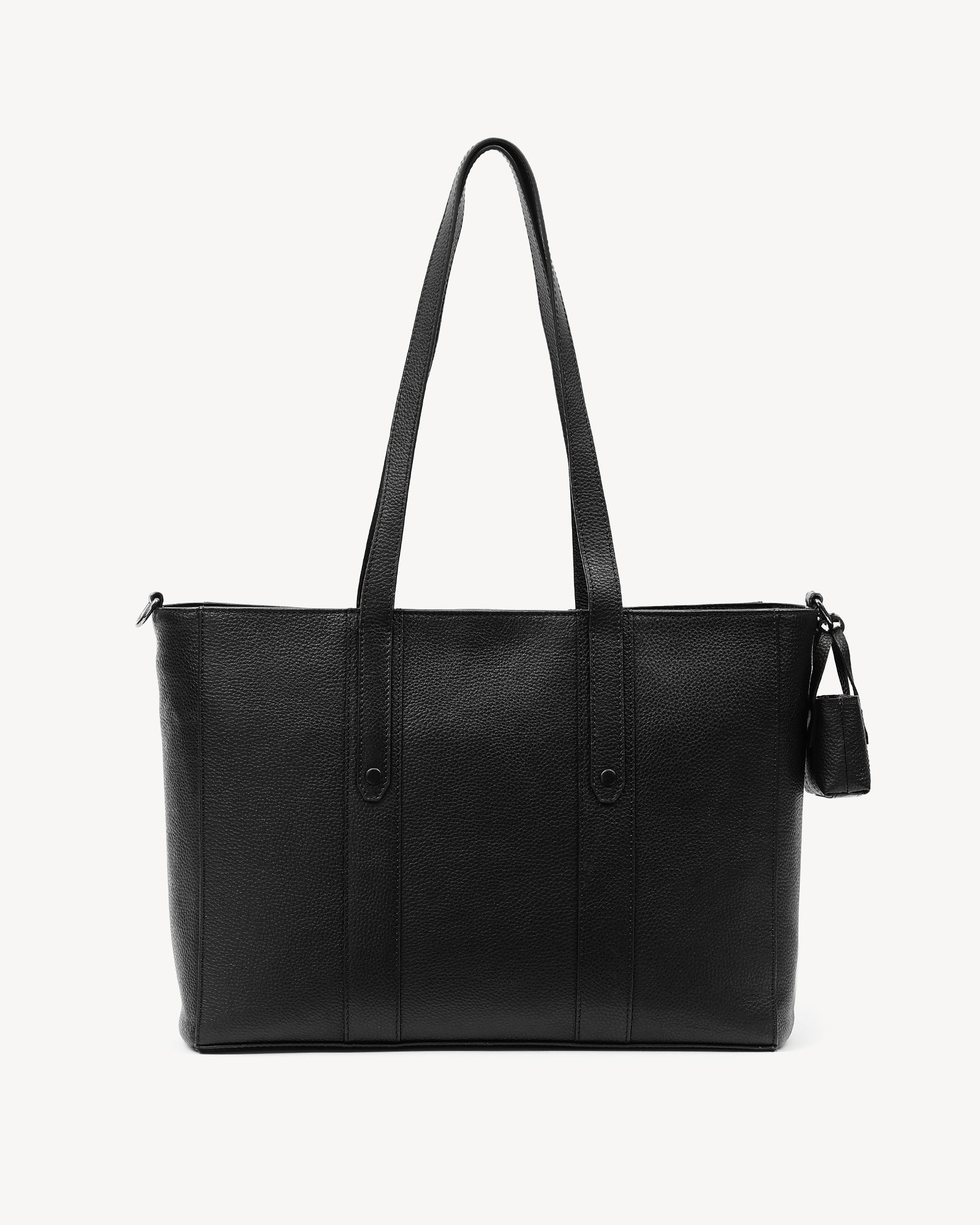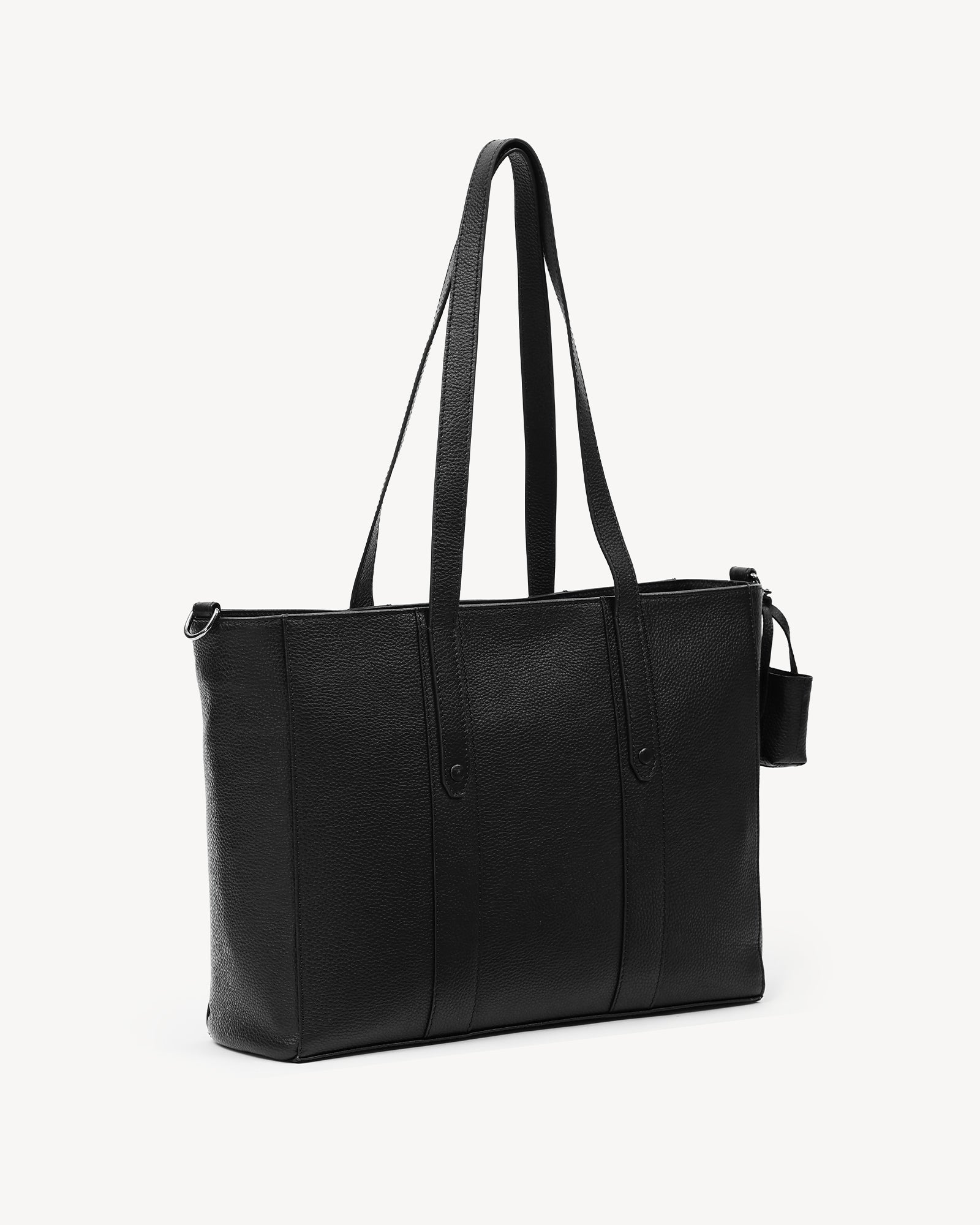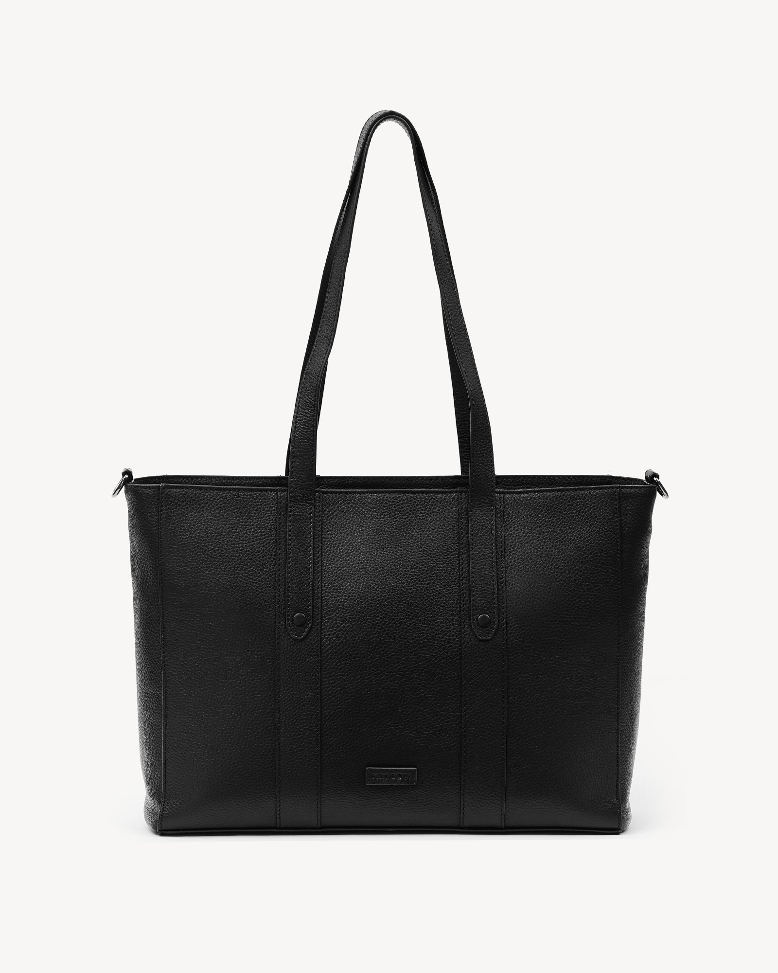 Redefining the art of everyday carry. Crafted from full-grain pebbled leather and accented with sleek gunmetal hardware, this bag merges understated luxury with intelligent design. Supple leather zipper pullers open to a spacious main compartment that accommodates up to a 16" laptop with ease. Inside, a zip pocket secures your valuables, while a slip pocket keeps daily essentials within quick reach. A complimentary mini pouch for your EarPods adds a refined touch of convenience. Effortless elegance, built to keep pace with modern life.