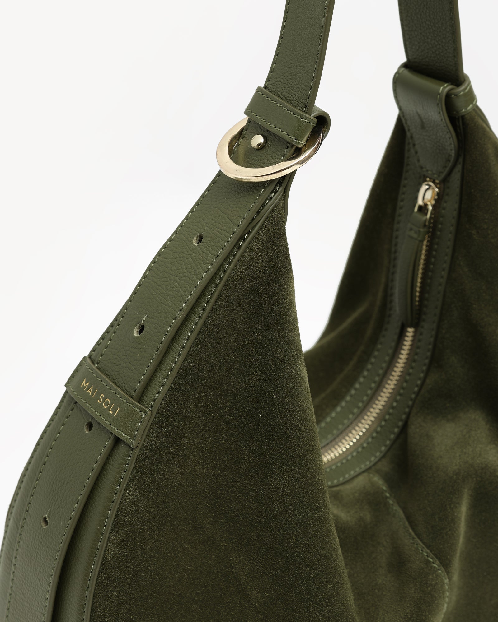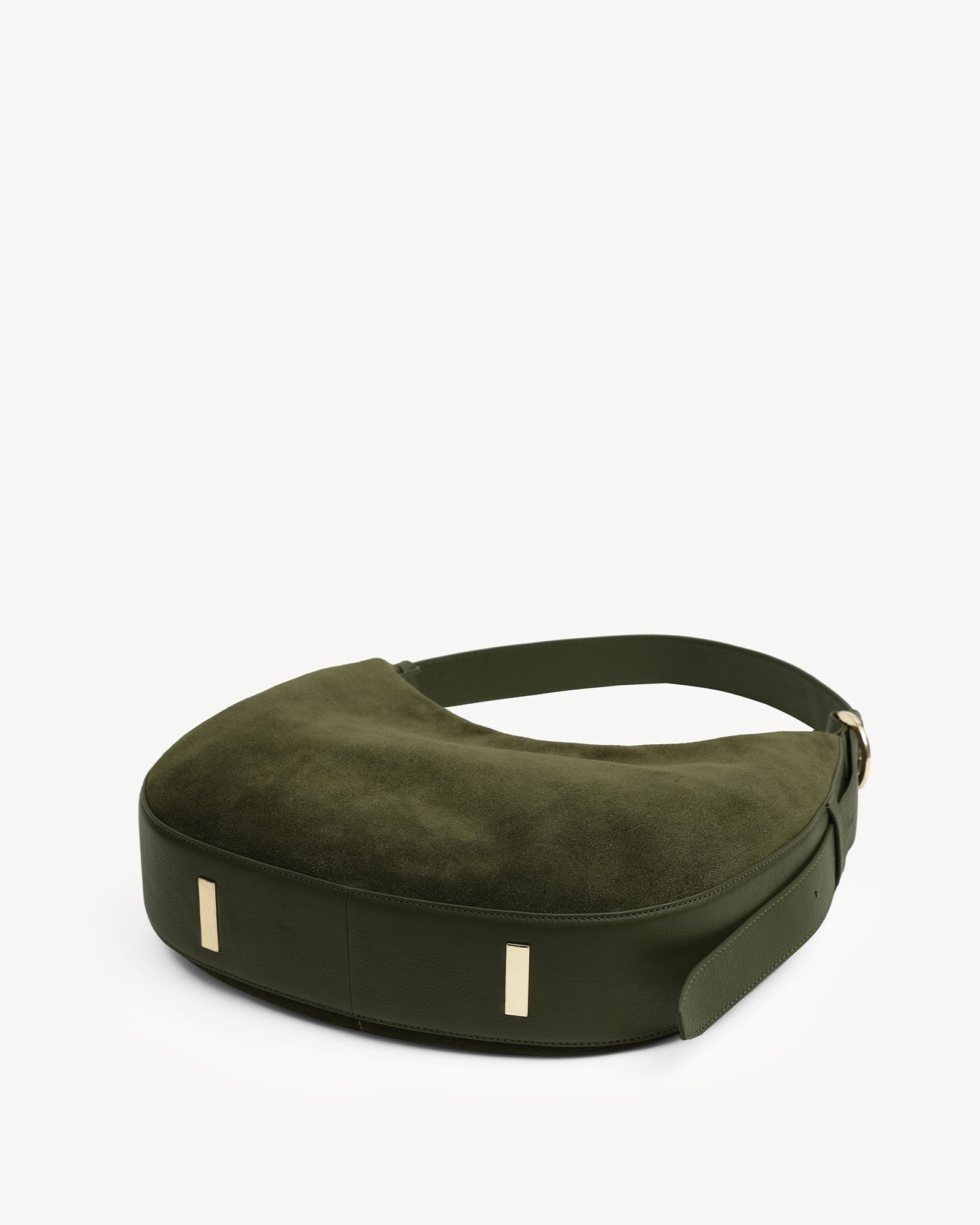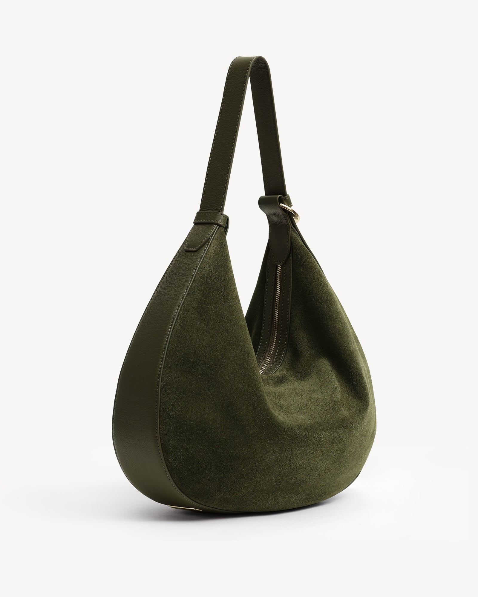 The Cadence Hobo Bag captures the art of quiet confidence — sculpted from sumptuous olive green Suede and full-grain Nappa leather into a fluid crescent form, that rests gracefully on your shoulder. Adorned with gold-tone hardware, this bag exudes and aura of refined luxury, while the spacious zippered interior ensures seamless organization.
