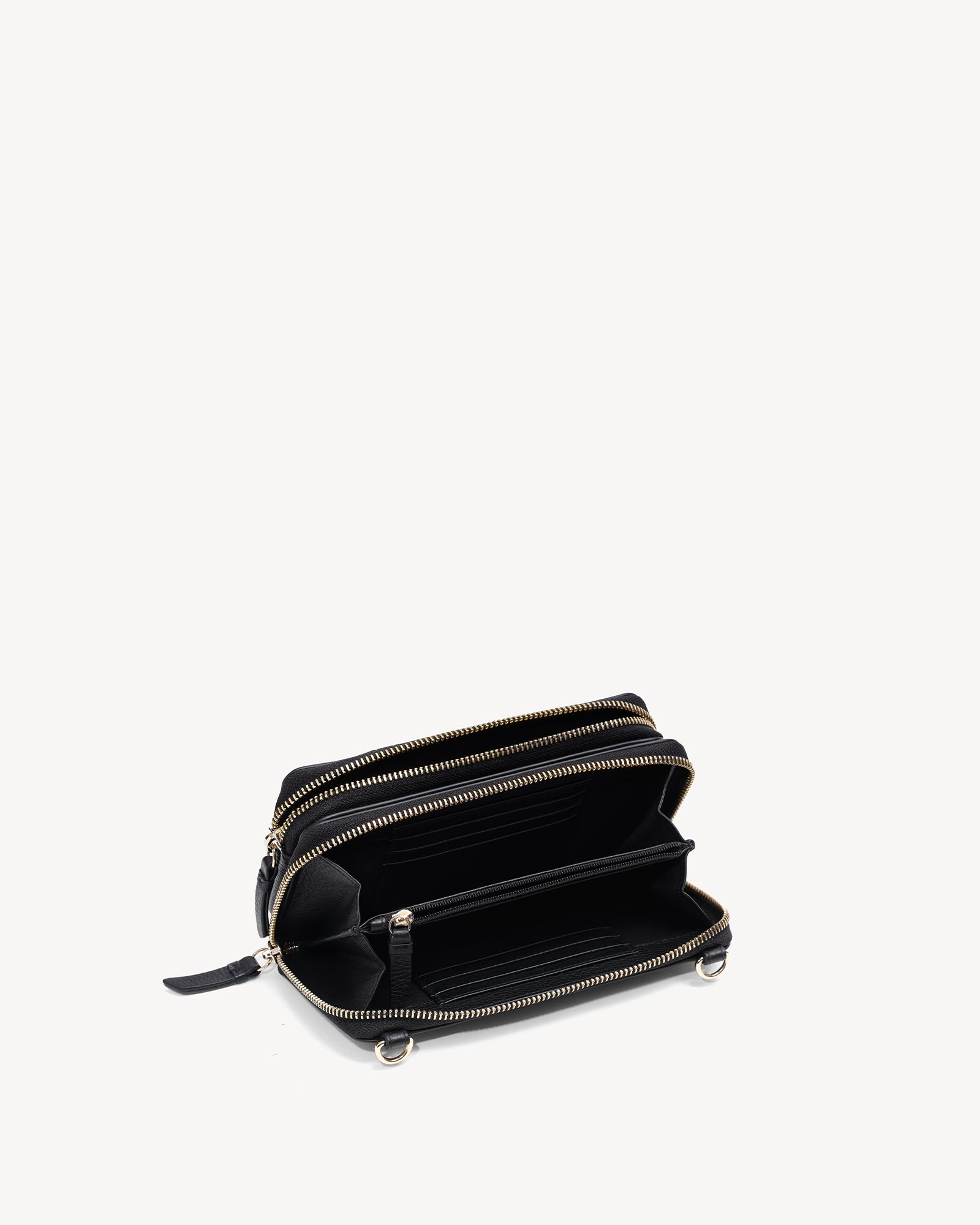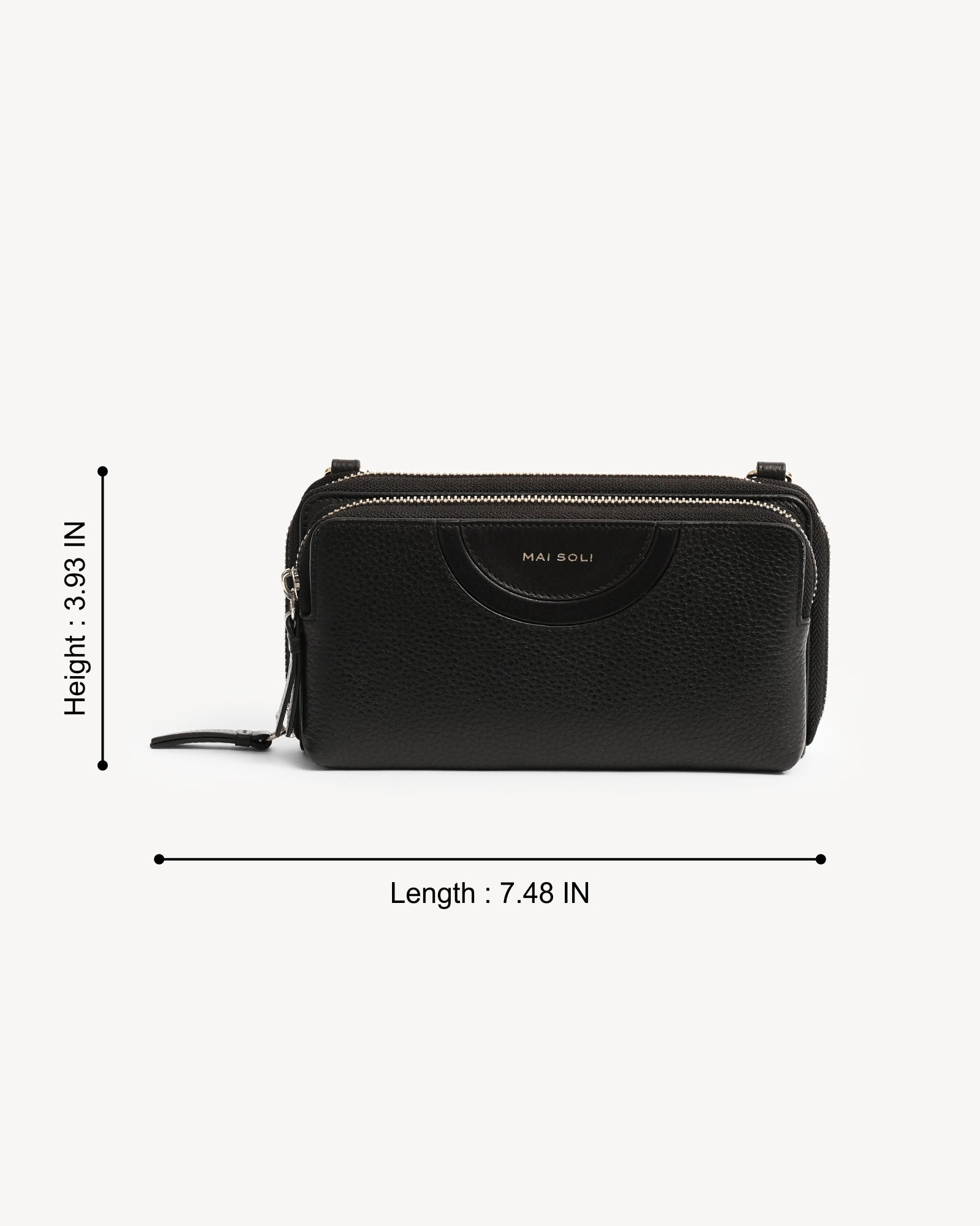 Crafted from full-grain pebbled leather and finished with refined light gold hardware, this bag balances understated luxury with functional design. A smooth zip closure secures your essentials, while a separate exterior zip compartment keeps your phone within easy reach. Thoughtfully designed interior pockets and a detachable leather sling allow it to shift effortlessly from a polished crossbody to a minimalist handheld clutch. Discreetly elegant, endlessly versatile.