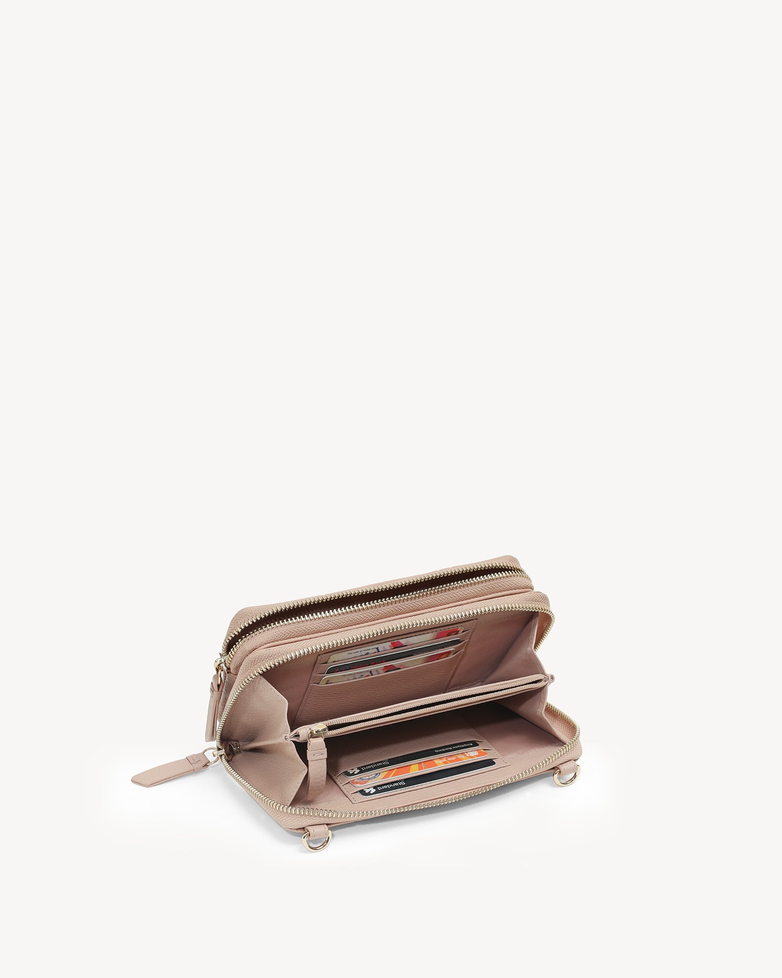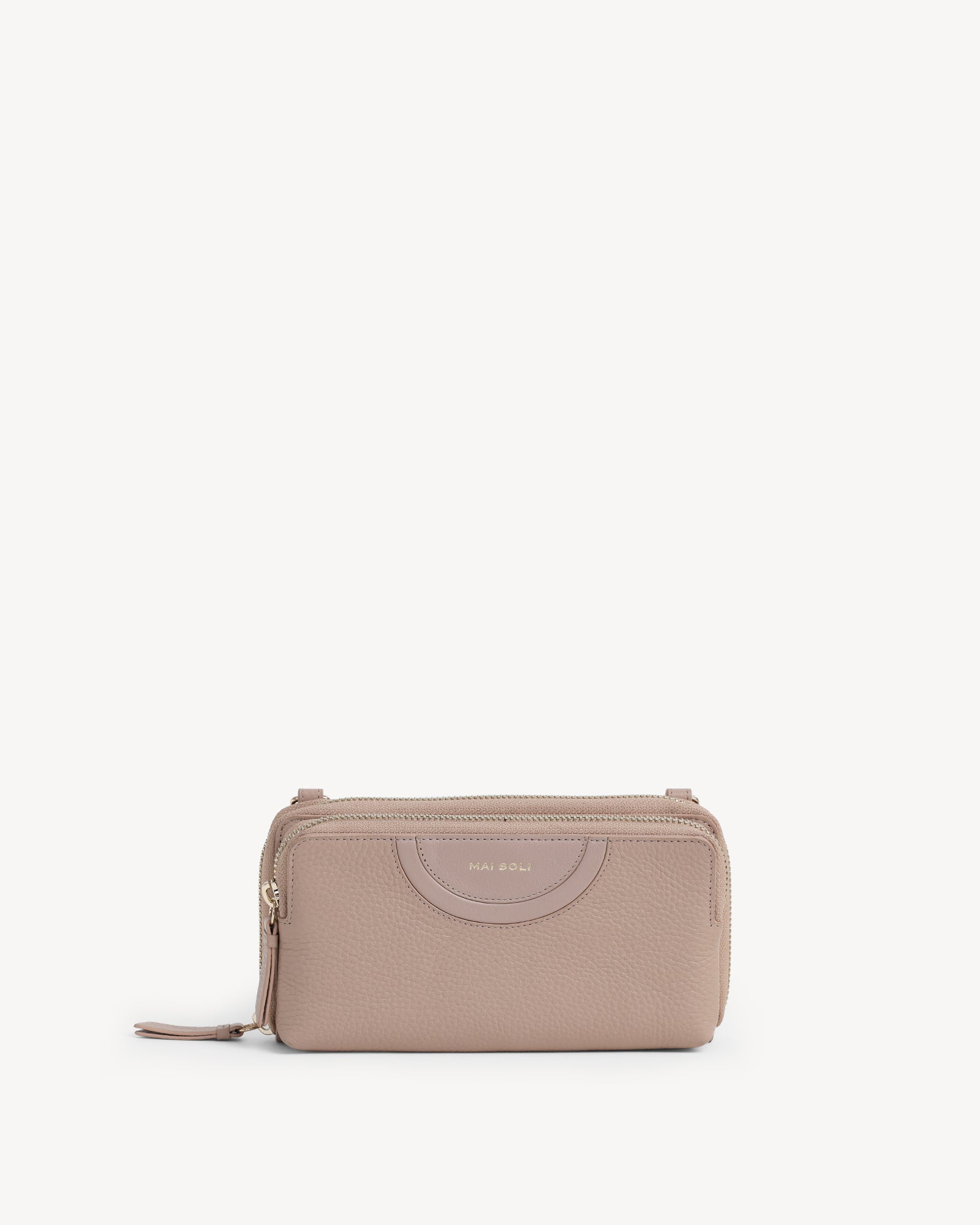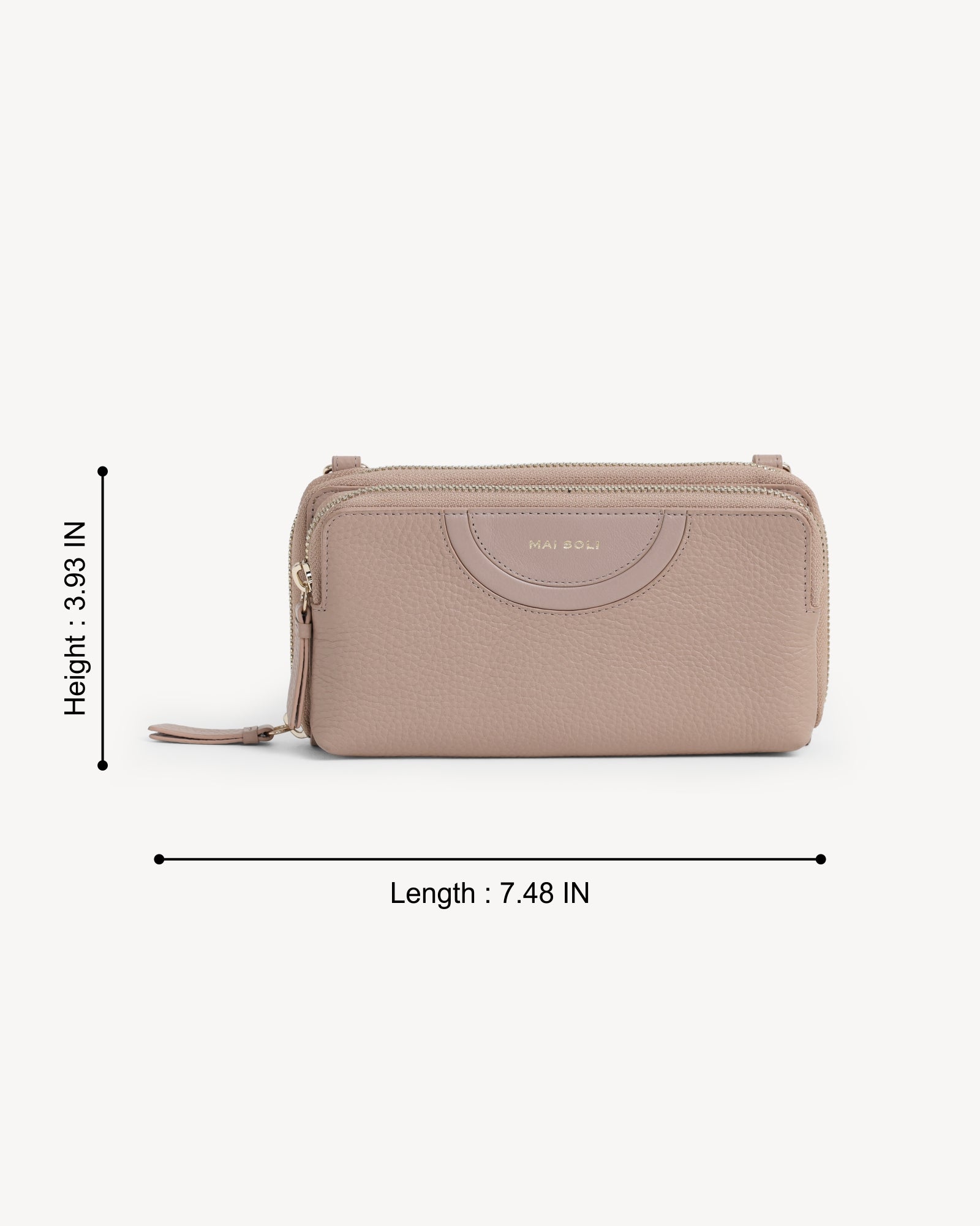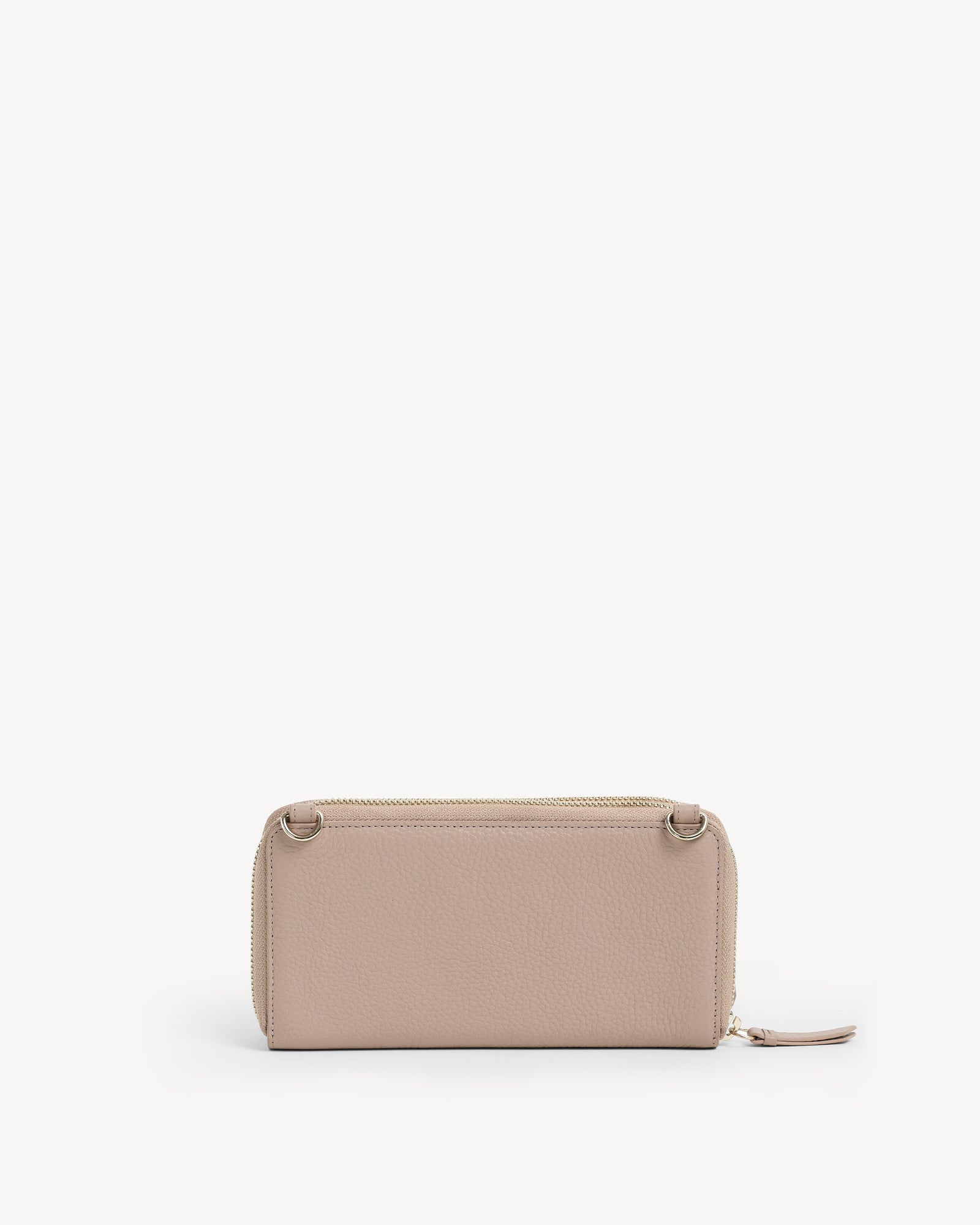 Crafted from full-grain pebbled leather and finished with refined light gold hardware, this bag balances understated luxury with functional design. A smooth zip closure secures your essentials, while a separate exterior zip compartment keeps your phone within easy reach. Thoughtfully designed interior pockets and a detachable leather sling allow it to shift effortlessly from a polished crossbody to a minimalist handheld clutch. Discreetly elegant, endlessly versatile.