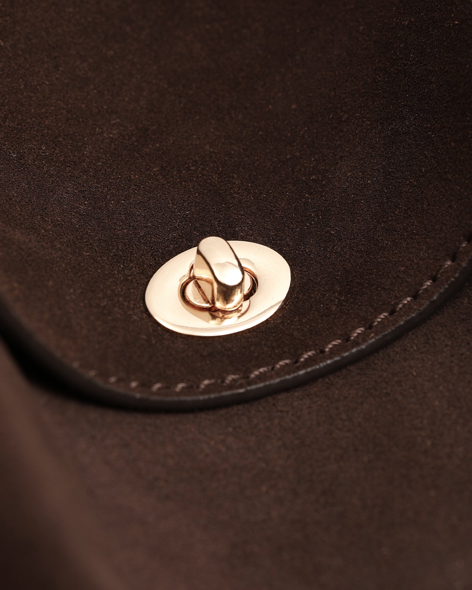 The Crescendo handbag — a fusion of artistry and minimalism, designed to effortlessly fit into your daily life. Expertly crafted from sumptuous deep brown Suede with full-grain Nappa leather trims, this unique silhouette unfolds with grace — from a sleek triangular pouch to a refined and roomy bucket form.