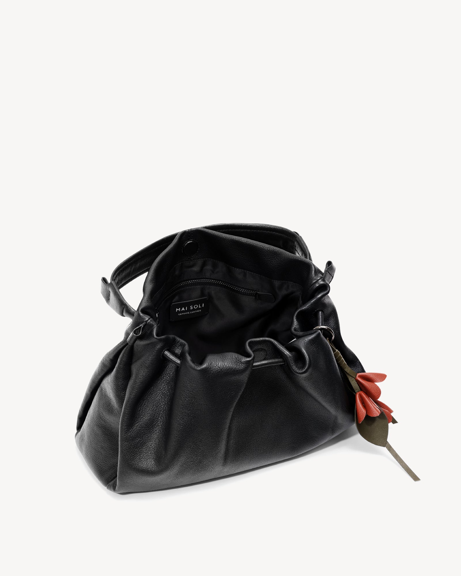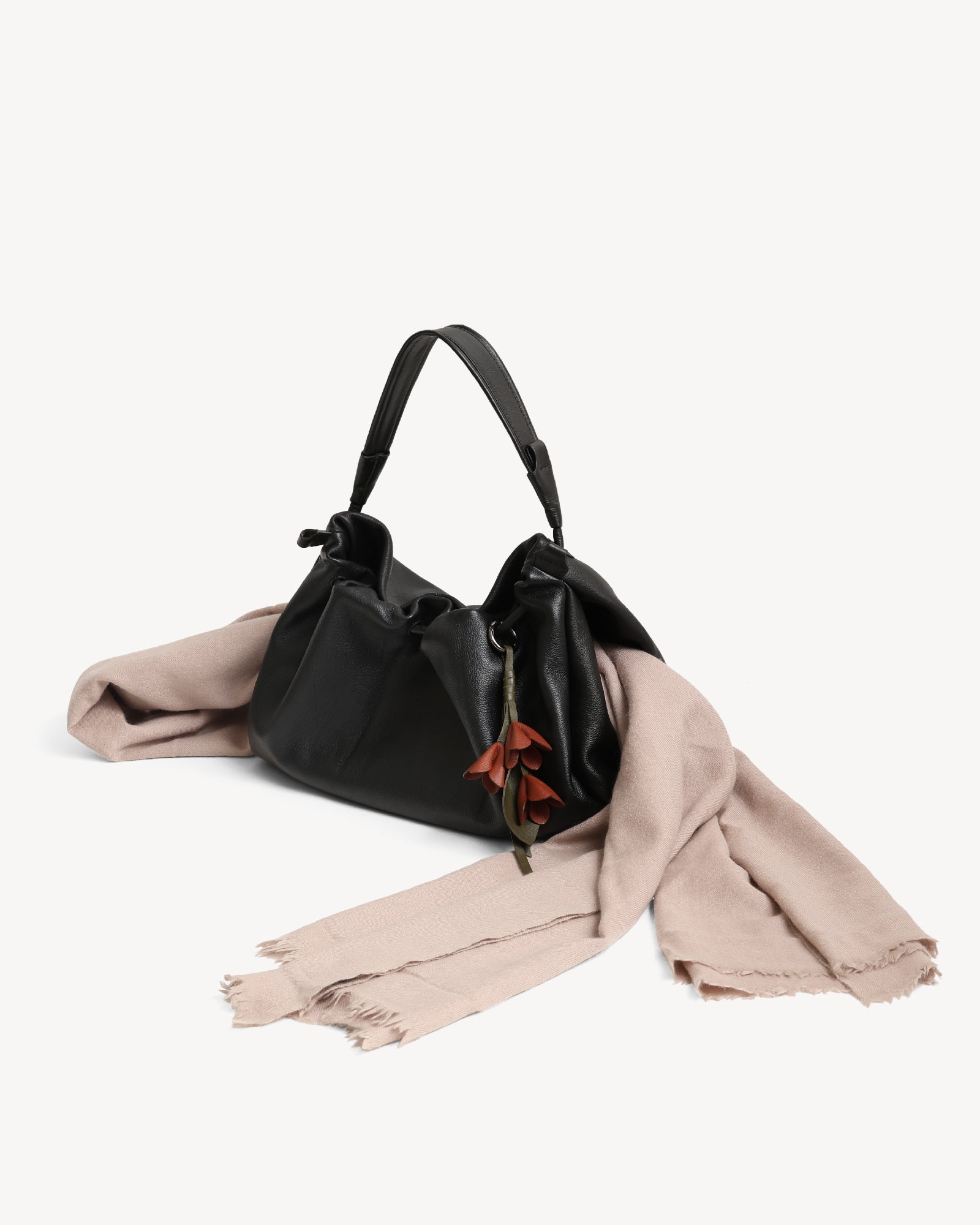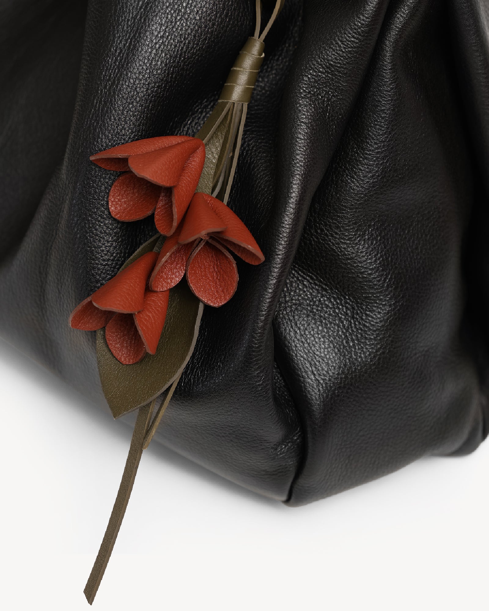 Made from supple full-grain Nappa leather with a durable polydrill lining, this bag balances softness and strength. Sleek gun metal fittings add polish, while the spacious main compartment with magnetic closure holds your daily essentials with ease. An internal zip pocket secures valuables, and a special concealed pocket, lets you hang a scarf in style. Finished with a delicate flower accent, it’s a modern statement for every day.