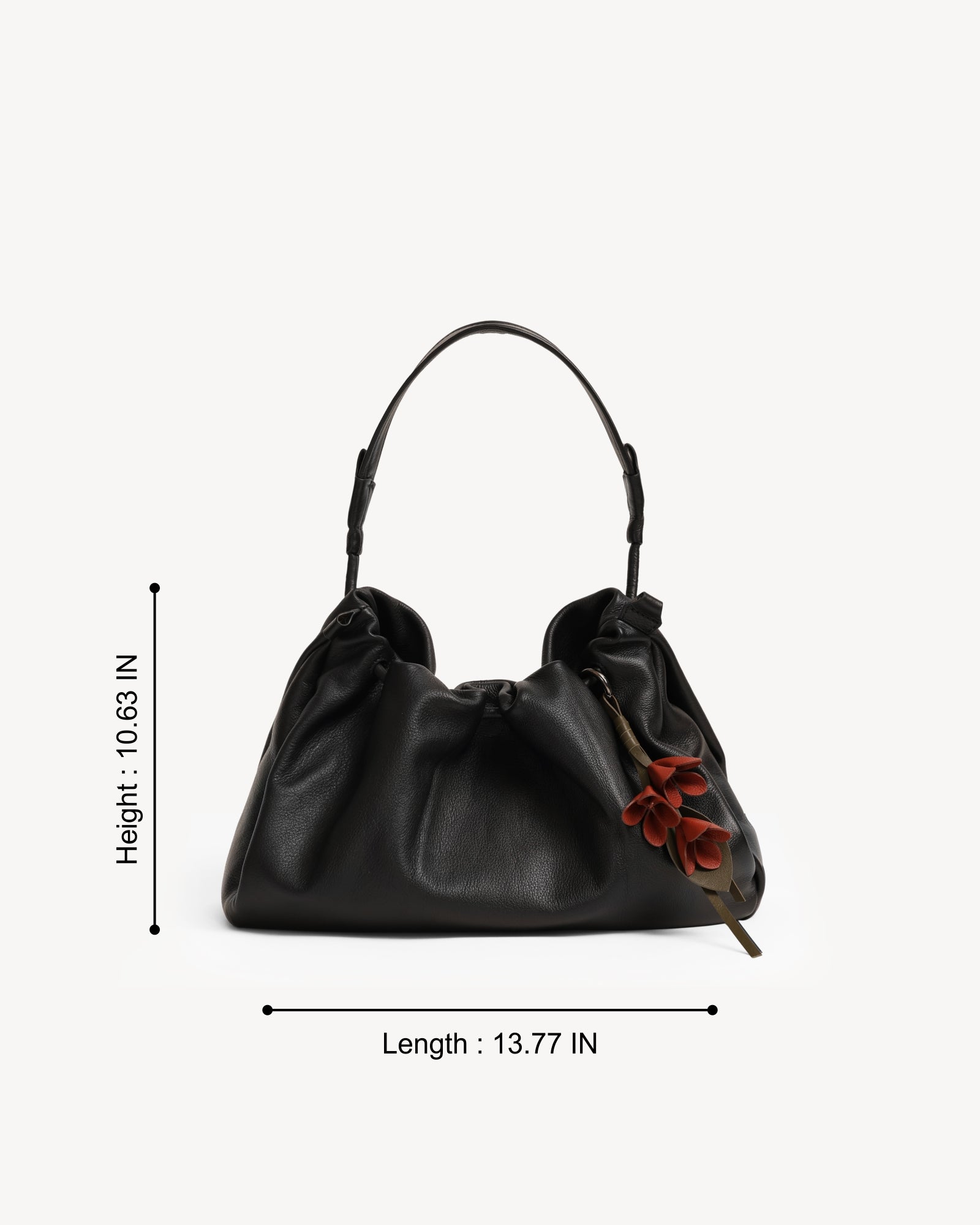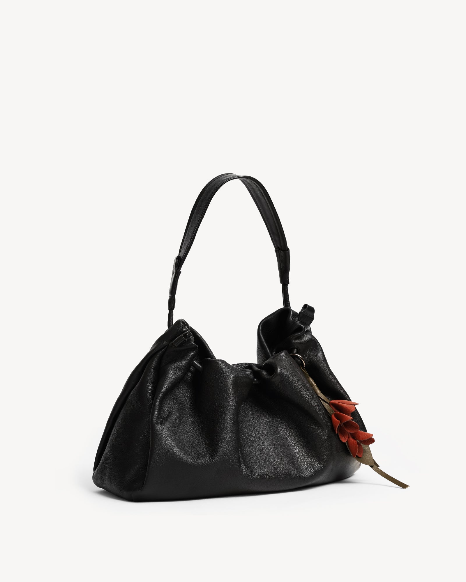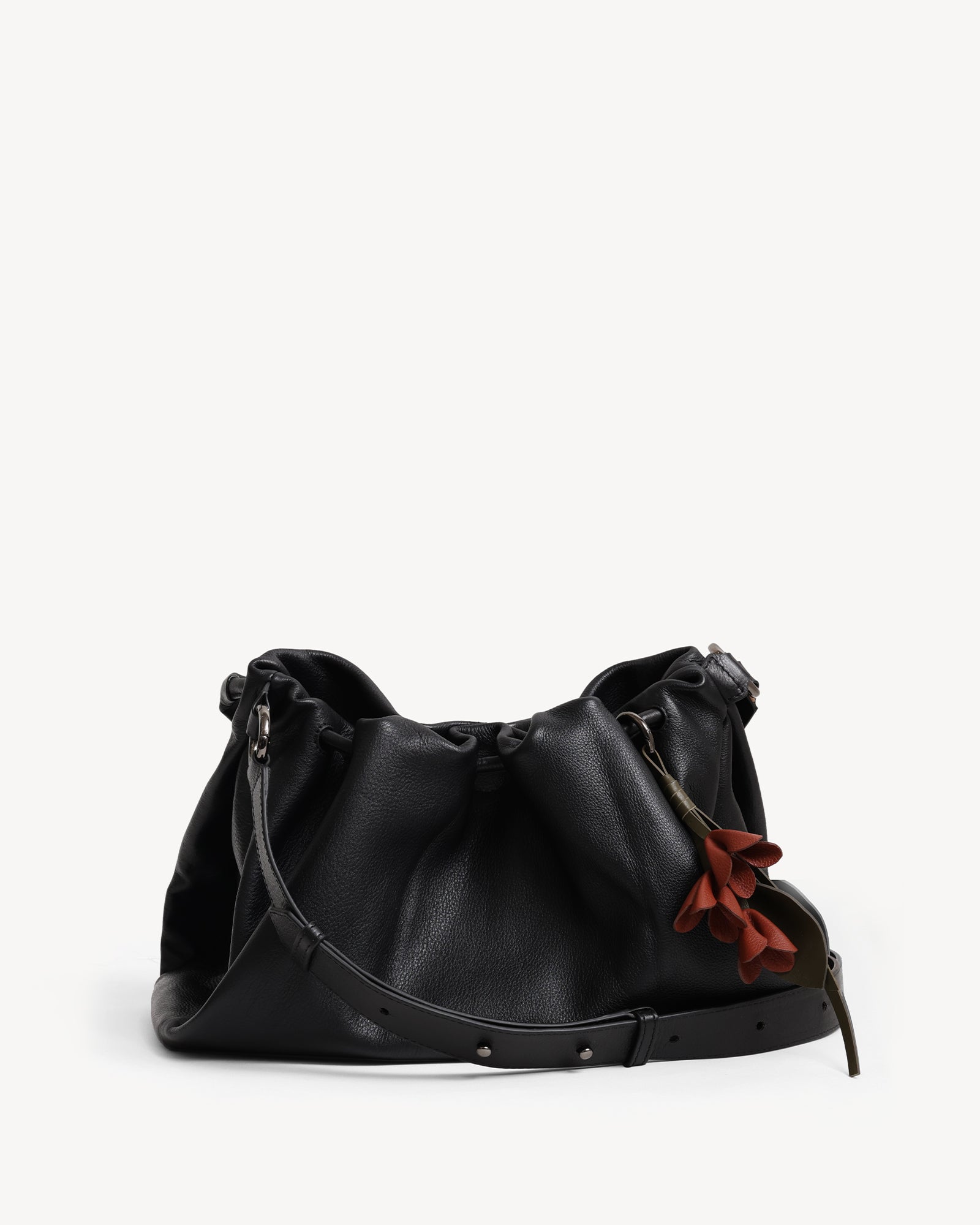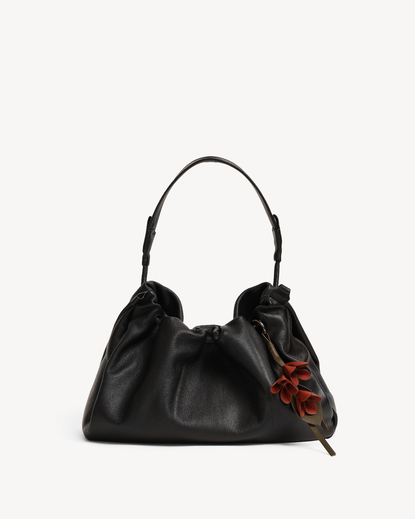 Made from supple full-grain Nappa leather with a durable polydrill lining, this bag balances softness and strength. Sleek gun metal fittings add polish, while the spacious main compartment with magnetic closure holds your daily essentials with ease. An internal zip pocket secures valuables, and a special concealed pocket, lets you hang a scarf in style. Finished with a delicate flower accent, it’s a modern statement for every day.