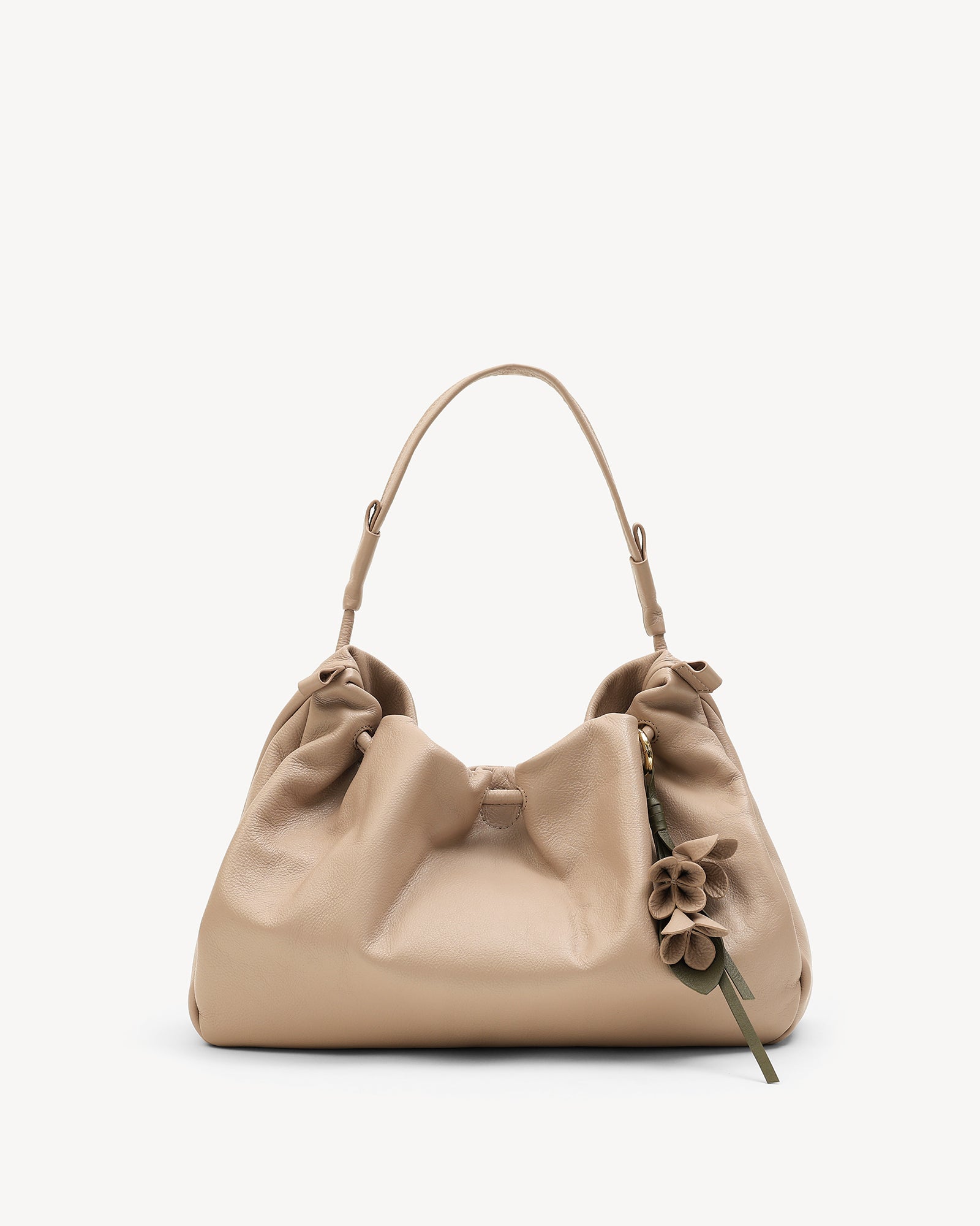 Made from supple full-grain Nappa leather with a durable polydrill lining, this bag balances softness and strength. Warm light gold fittings add polish, while the spacious main compartment with magnetic closure holds your daily essentials with ease. An internal zip pocket secures valuables, and a special concealed pocket, lets you hang a scarf in style. Finished with a delicate flower accent, it’s a modern statement for every day.