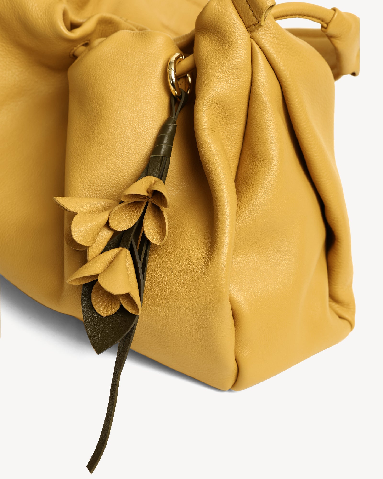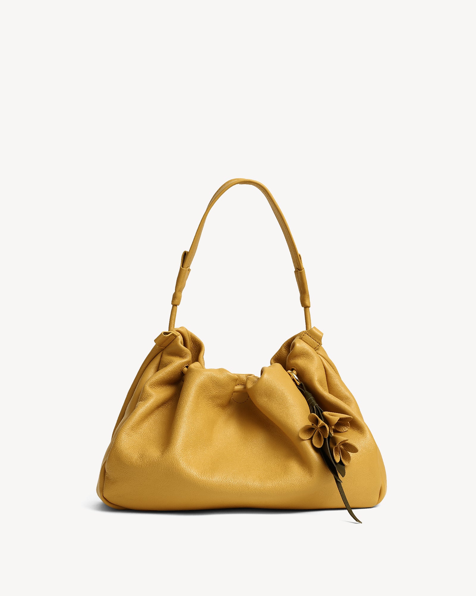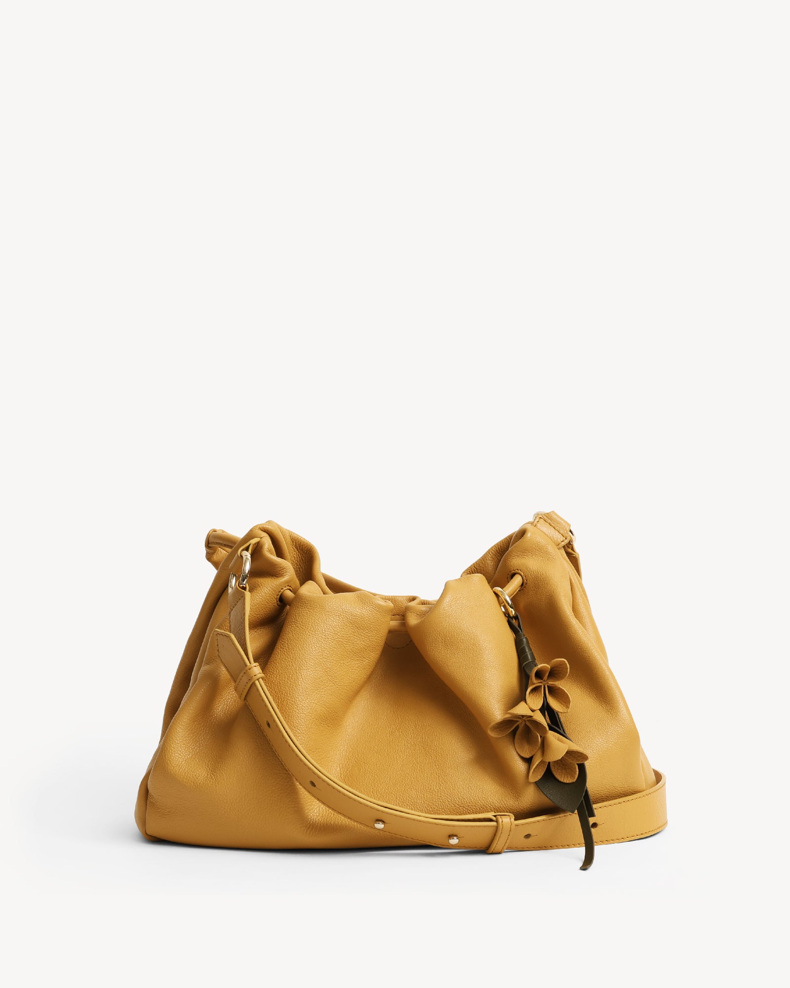 Made from supple full-grain Nappa leather with a durable polydrill lining, this bag balances softness and strength. Warm light gold fittings add polish, while the spacious main compartment with magnetic closure holds your daily essentials with ease. An internal zip pocket secures valuables, and a special concealed pocket, lets you hang a scarf in style. Finished with a delicate flower accent, it’s a modern statement for every day.