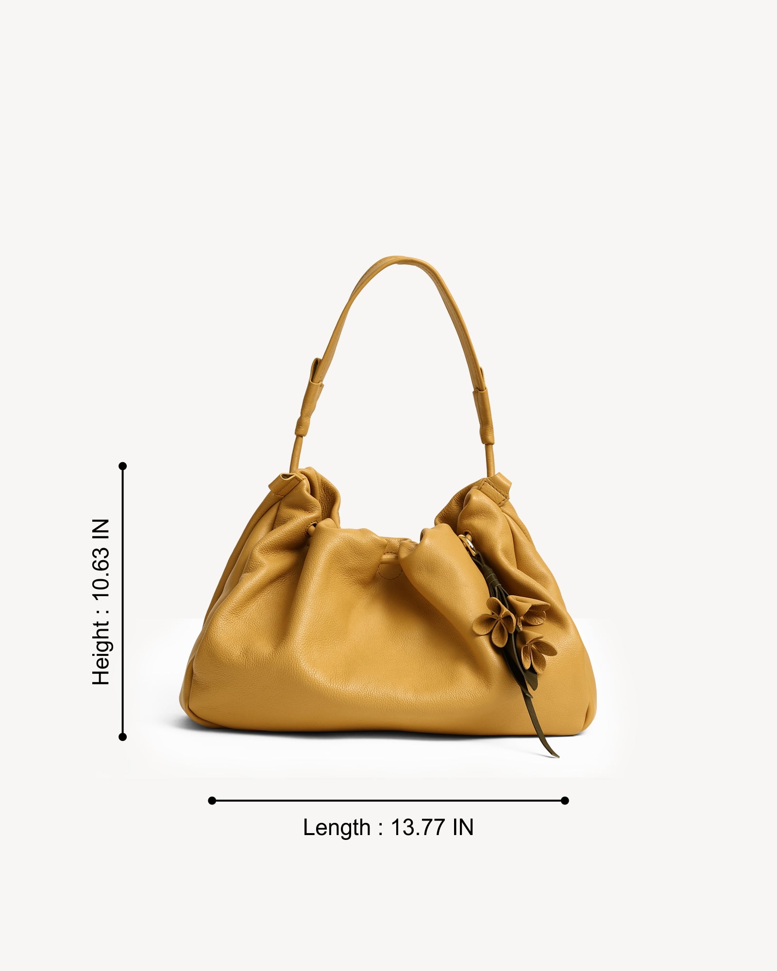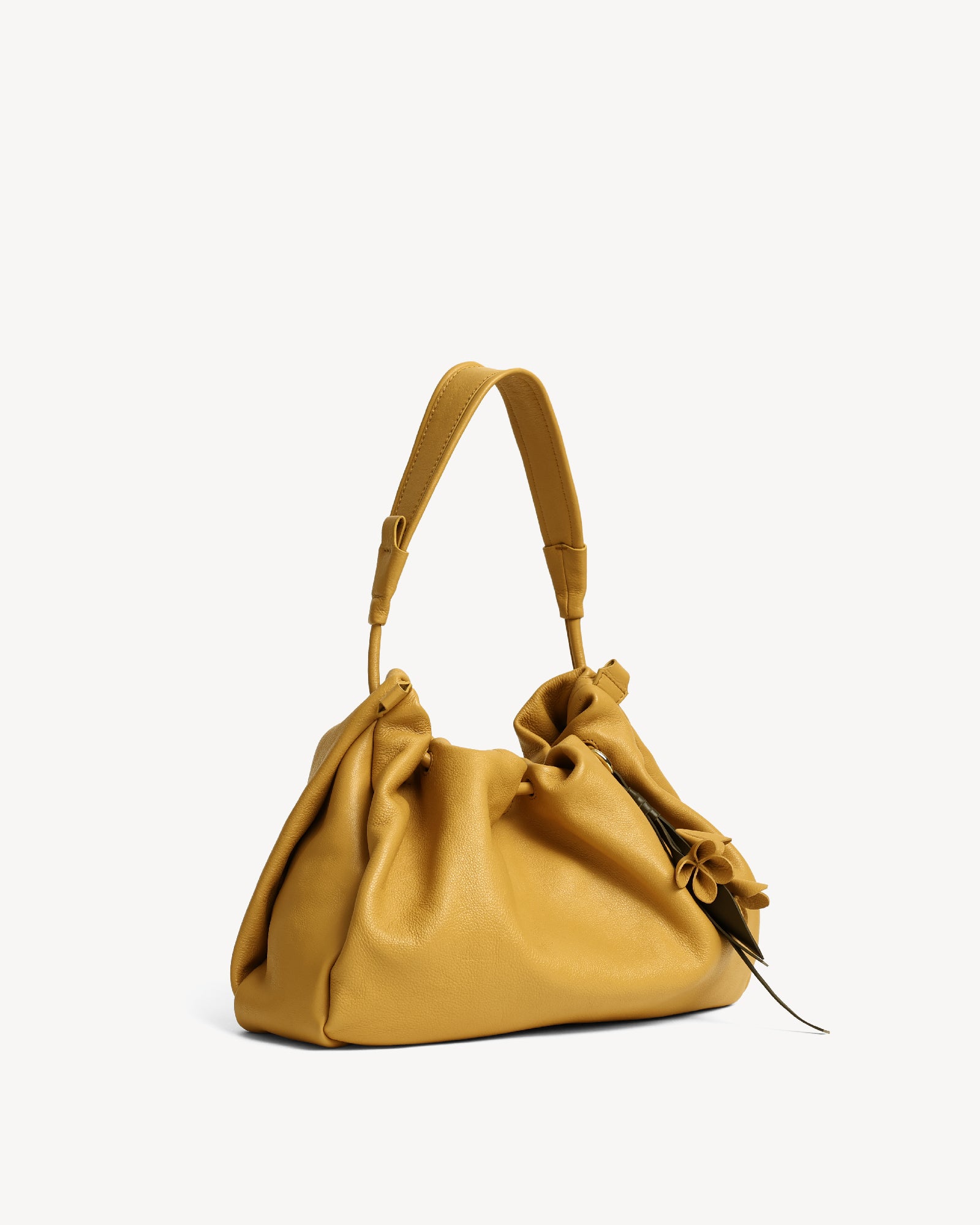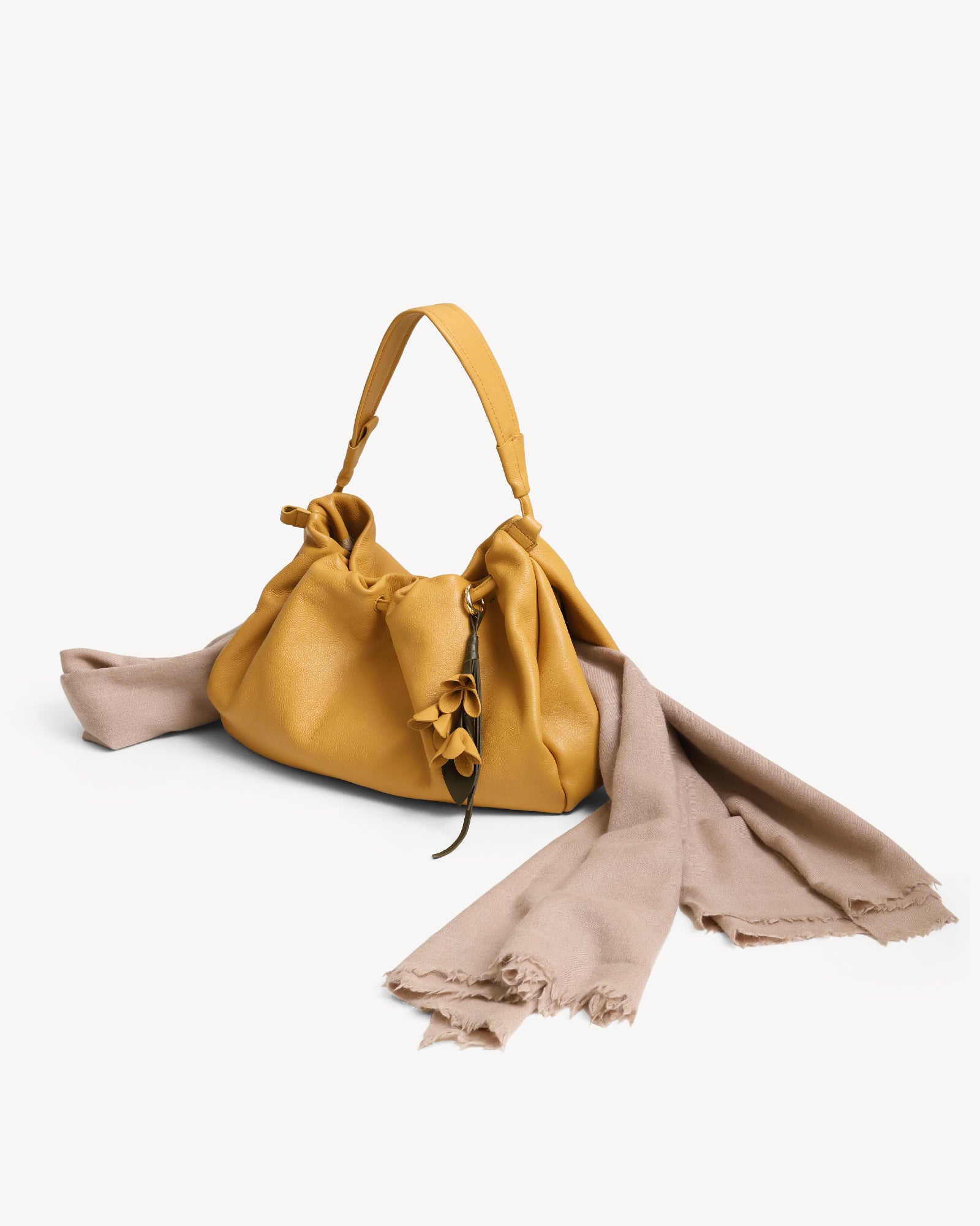 Made from supple full-grain Nappa leather with a durable polydrill lining, this bag balances softness and strength. Warm light gold fittings add polish, while the spacious main compartment with magnetic closure holds your daily essentials with ease. An internal zip pocket secures valuables, and a special concealed pocket, lets you hang a scarf in style. Finished with a delicate flower accent, it’s a modern statement for every day.
