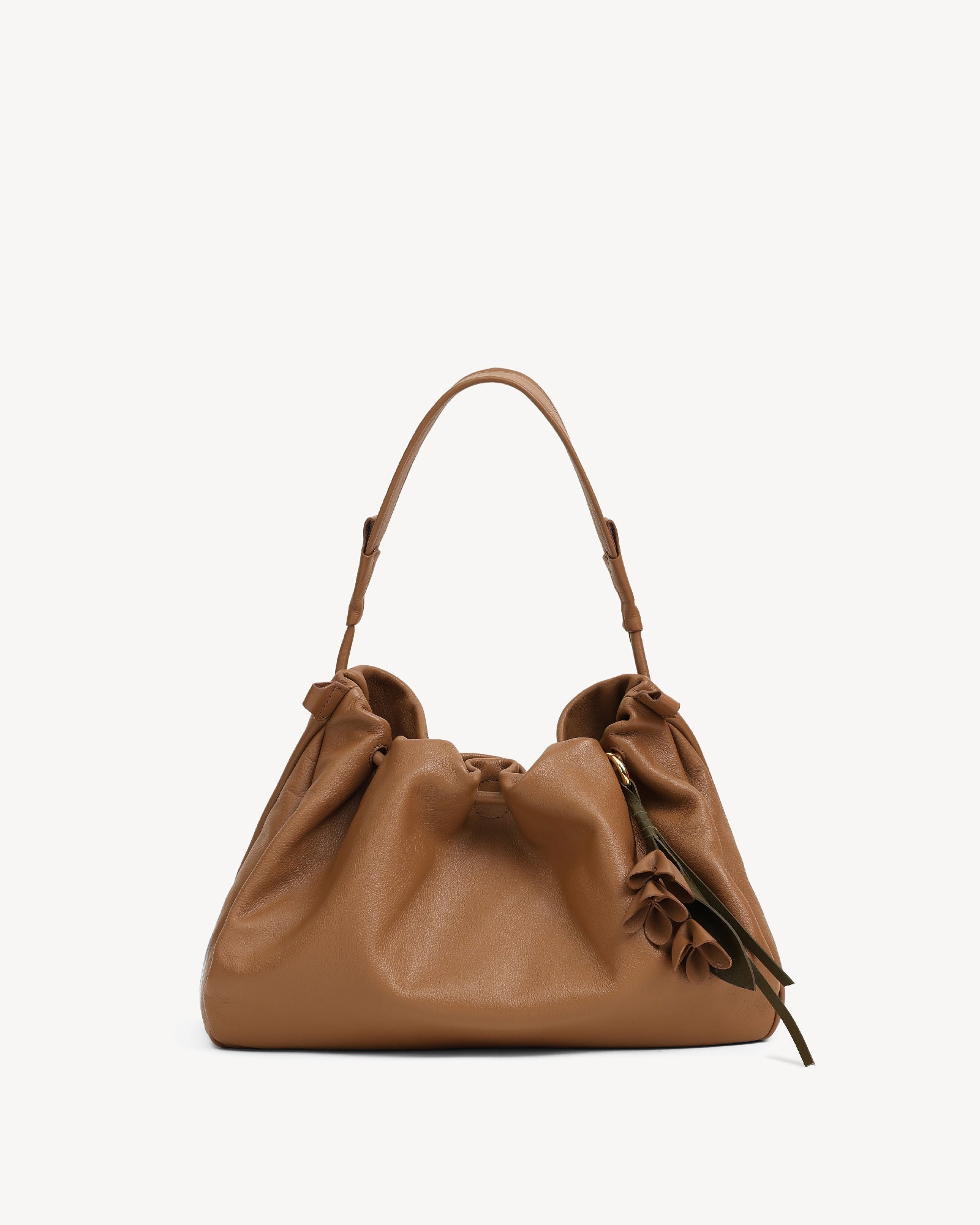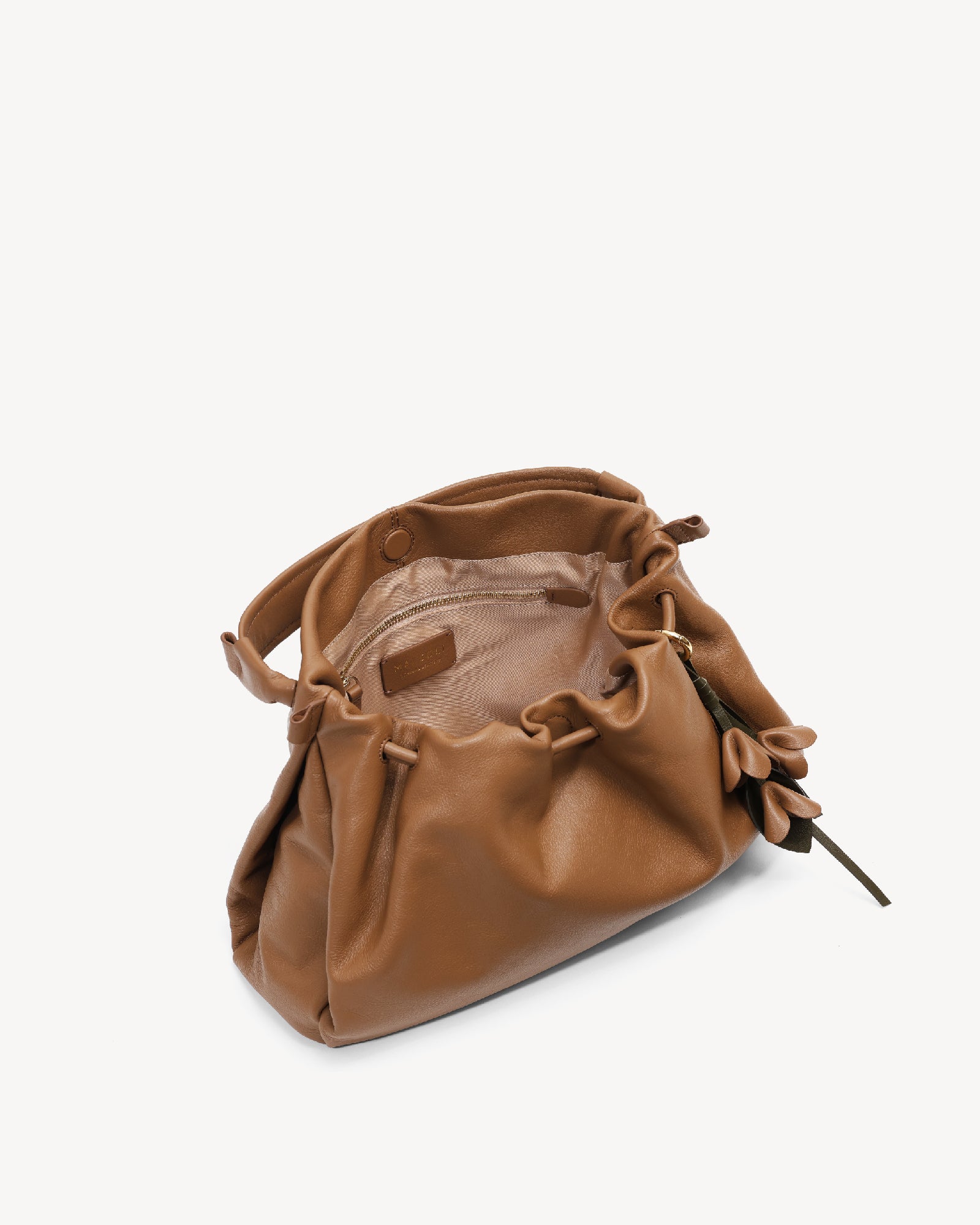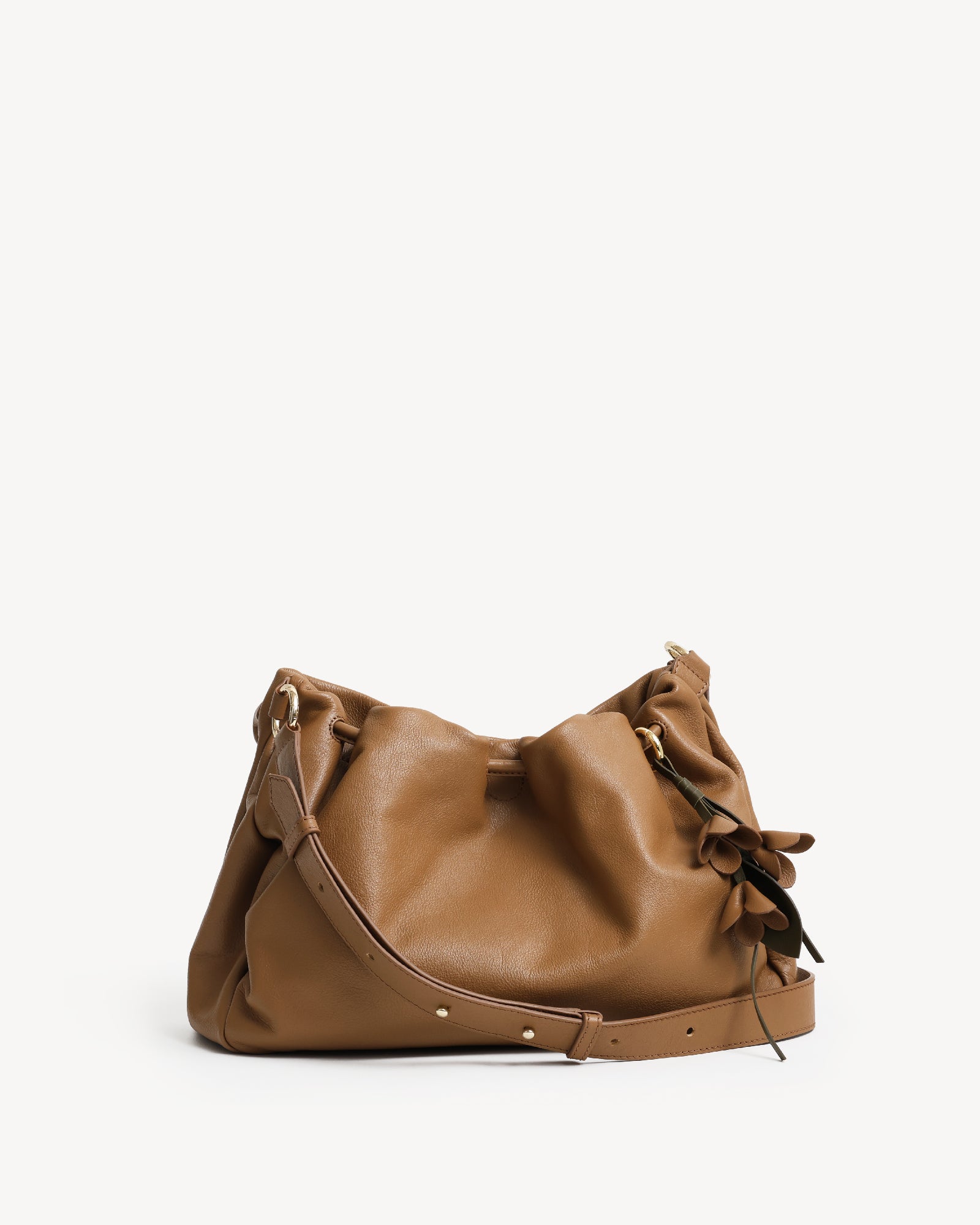 Made from supple full-grain Nappa leather with a durable polydrill lining, this bag balances softness and strength. Warm light gold fittings add polish, while the spacious main compartment with magnetic closure holds your daily essentials with ease. An internal zip pocket secures valuables, and a special concealed pocket, lets you hang a scarf in style. Finished with a delicate flower accent, it’s a modern statement for every day.