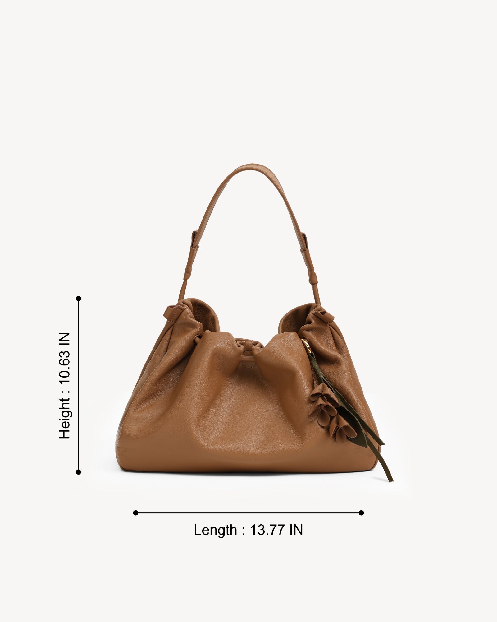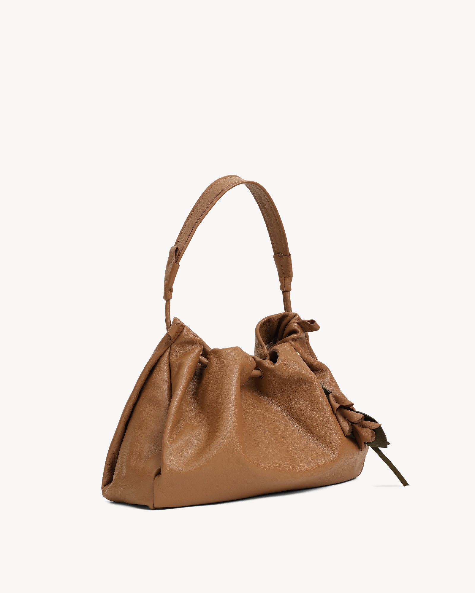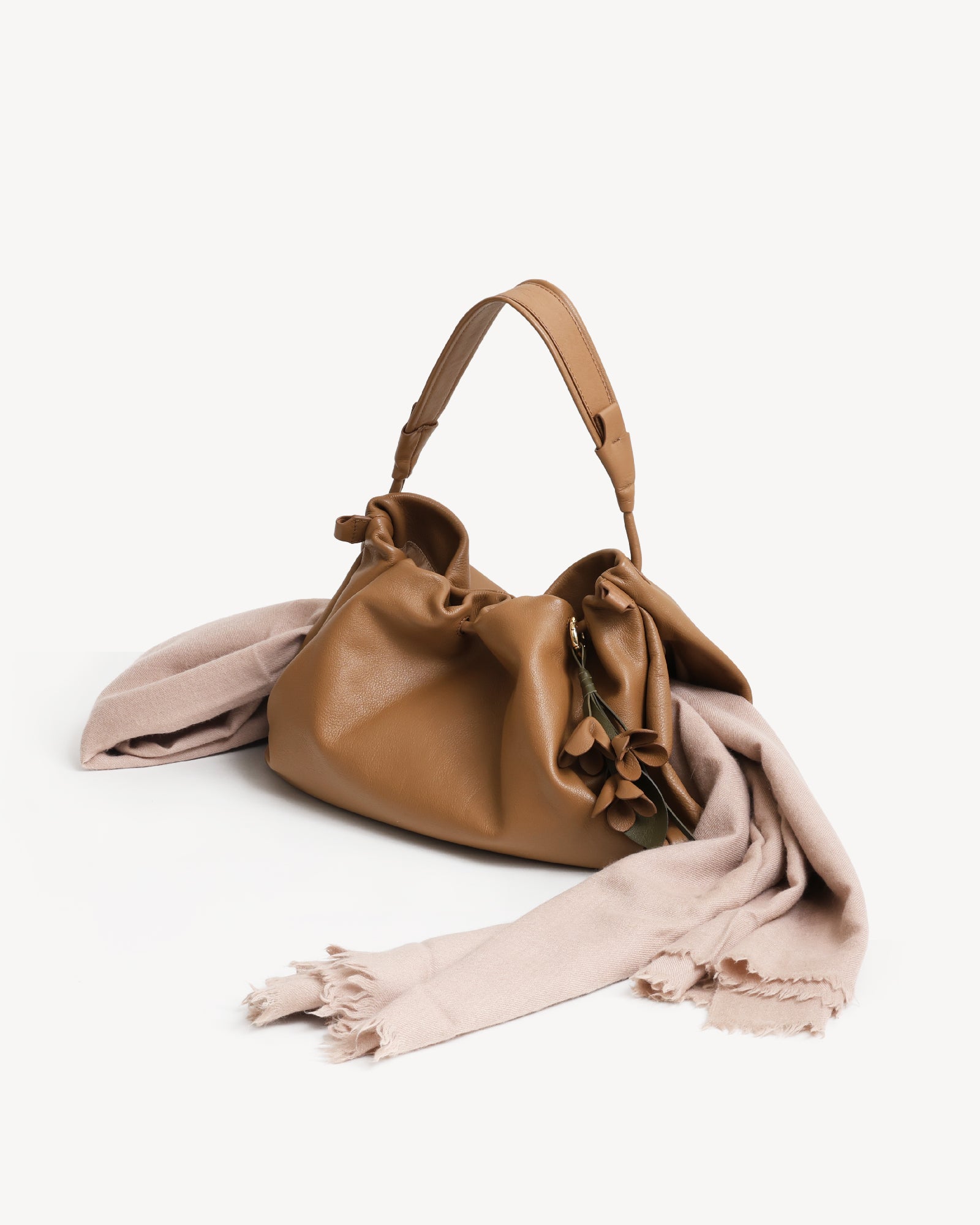 Made from supple full-grain Nappa leather with a durable polydrill lining, this bag balances softness and strength. Warm light gold fittings add polish, while the spacious main compartment with magnetic closure holds your daily essentials with ease. An internal zip pocket secures valuables, and a special concealed pocket, lets you hang a scarf in style. Finished with a delicate flower accent, it’s a modern statement for every day.