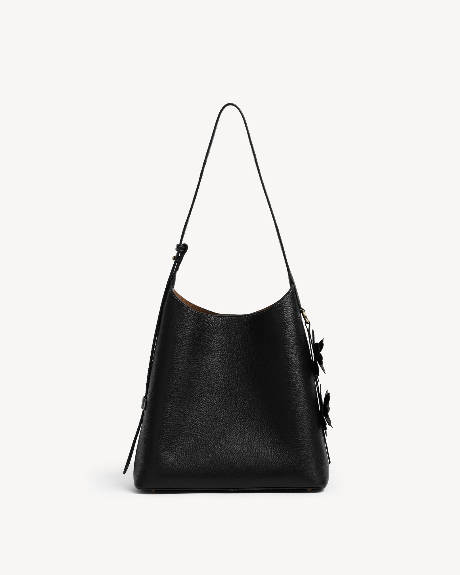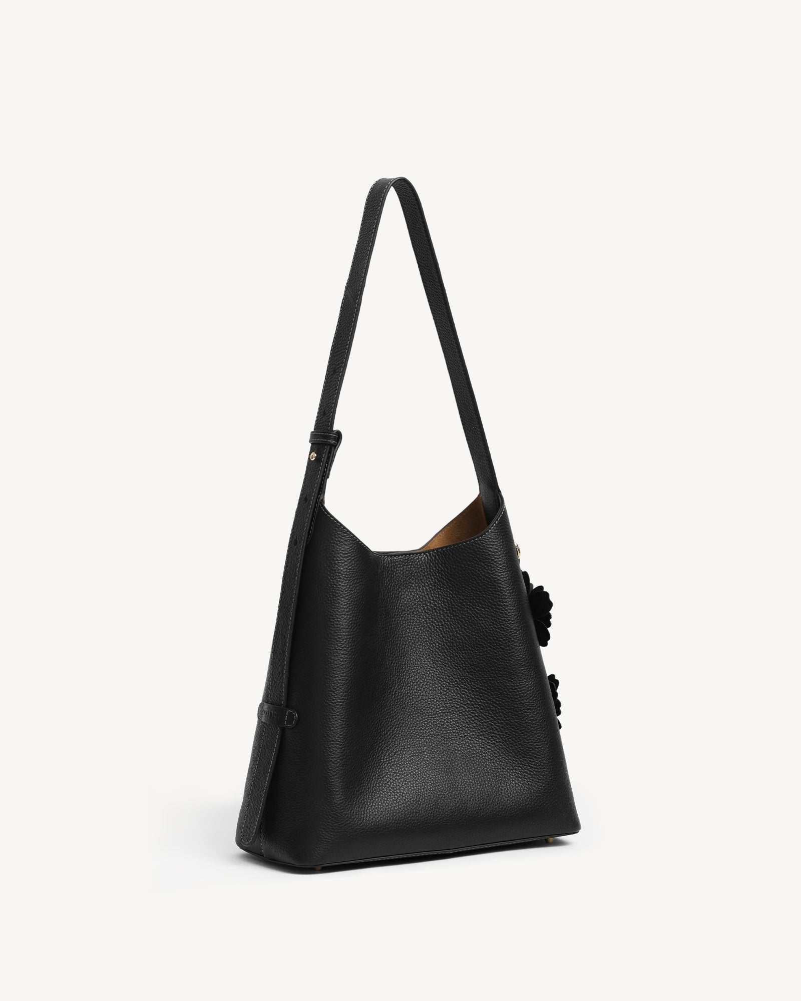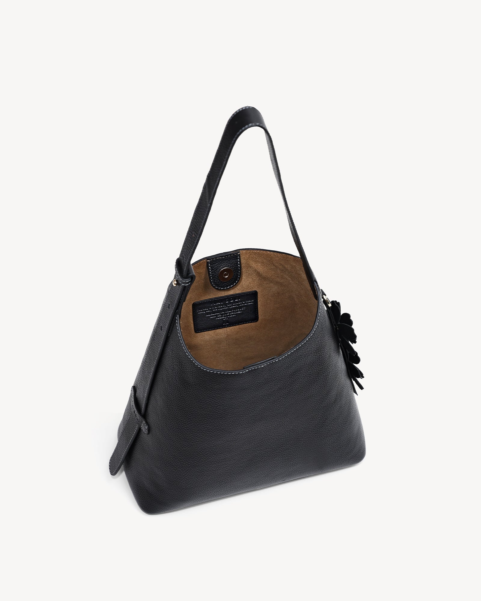 Made from soft, full-grain leather with a rich pebbled texture, this bag blends timeless style with everyday ease. Its classic shape moves effortlessly from work to evening, while a suede-lined interior and light-gold accents add subtle luxury. Finished with a delicate flower charm and an adjustable strap, it’s designed to keep up with your day in quietly confident style.