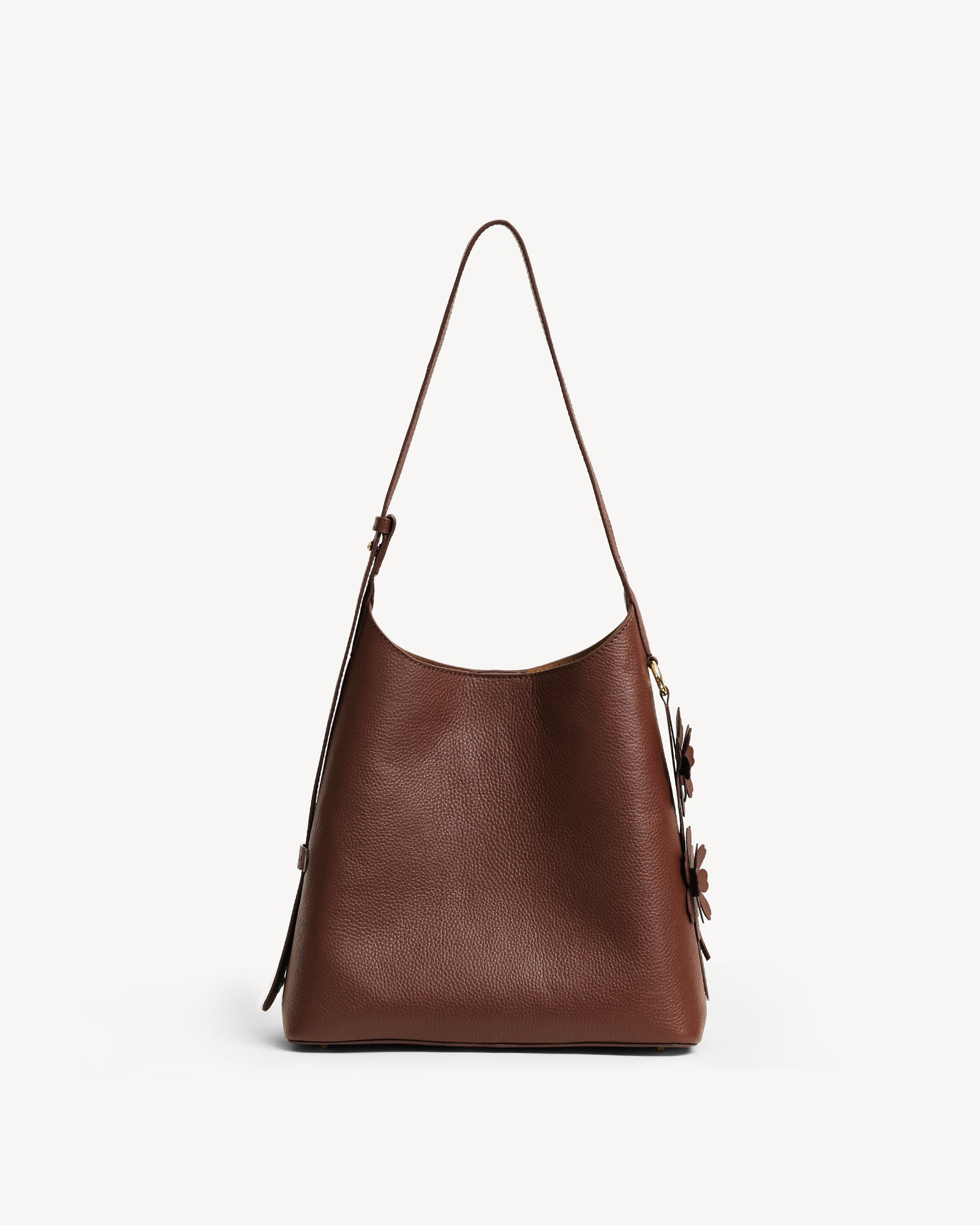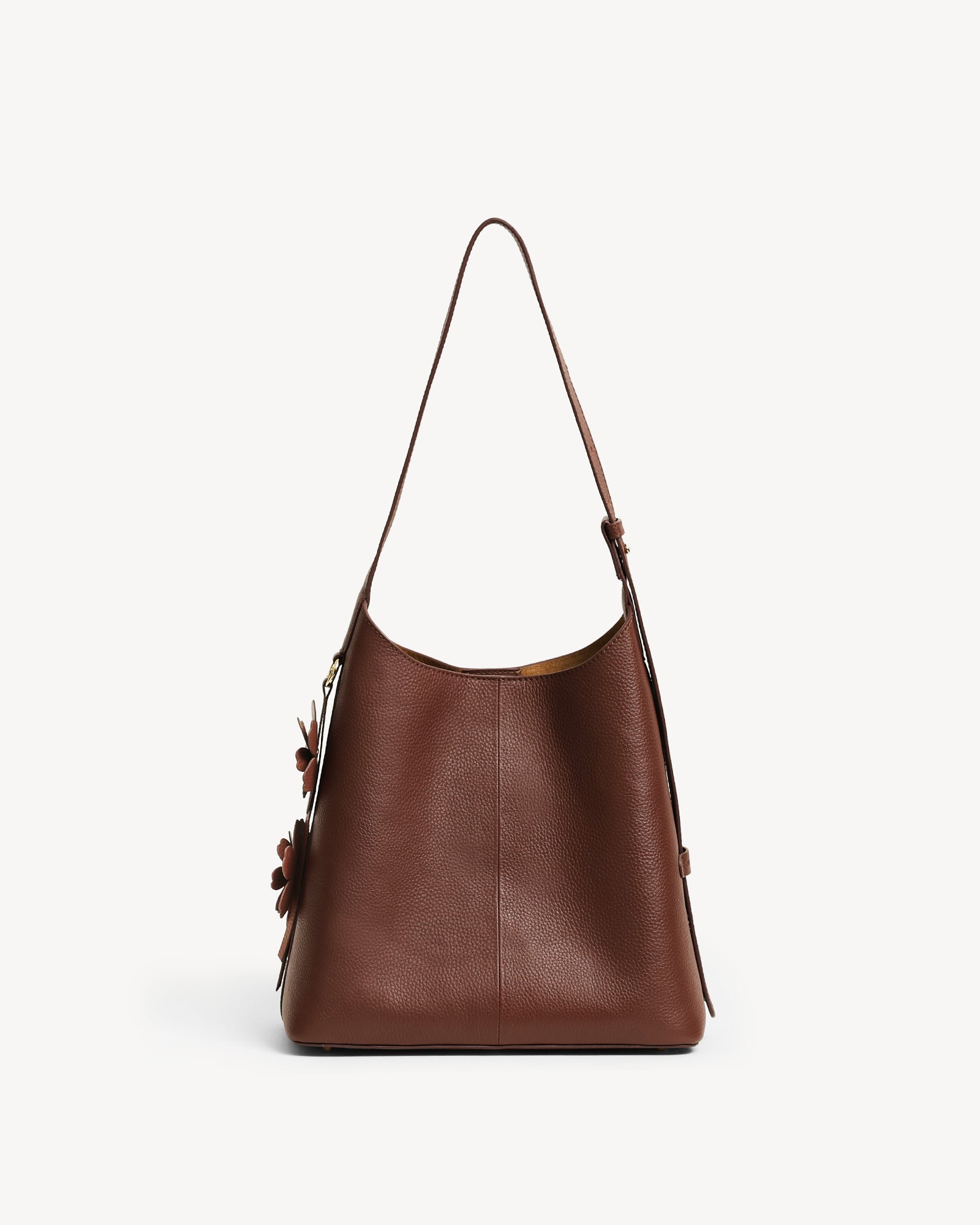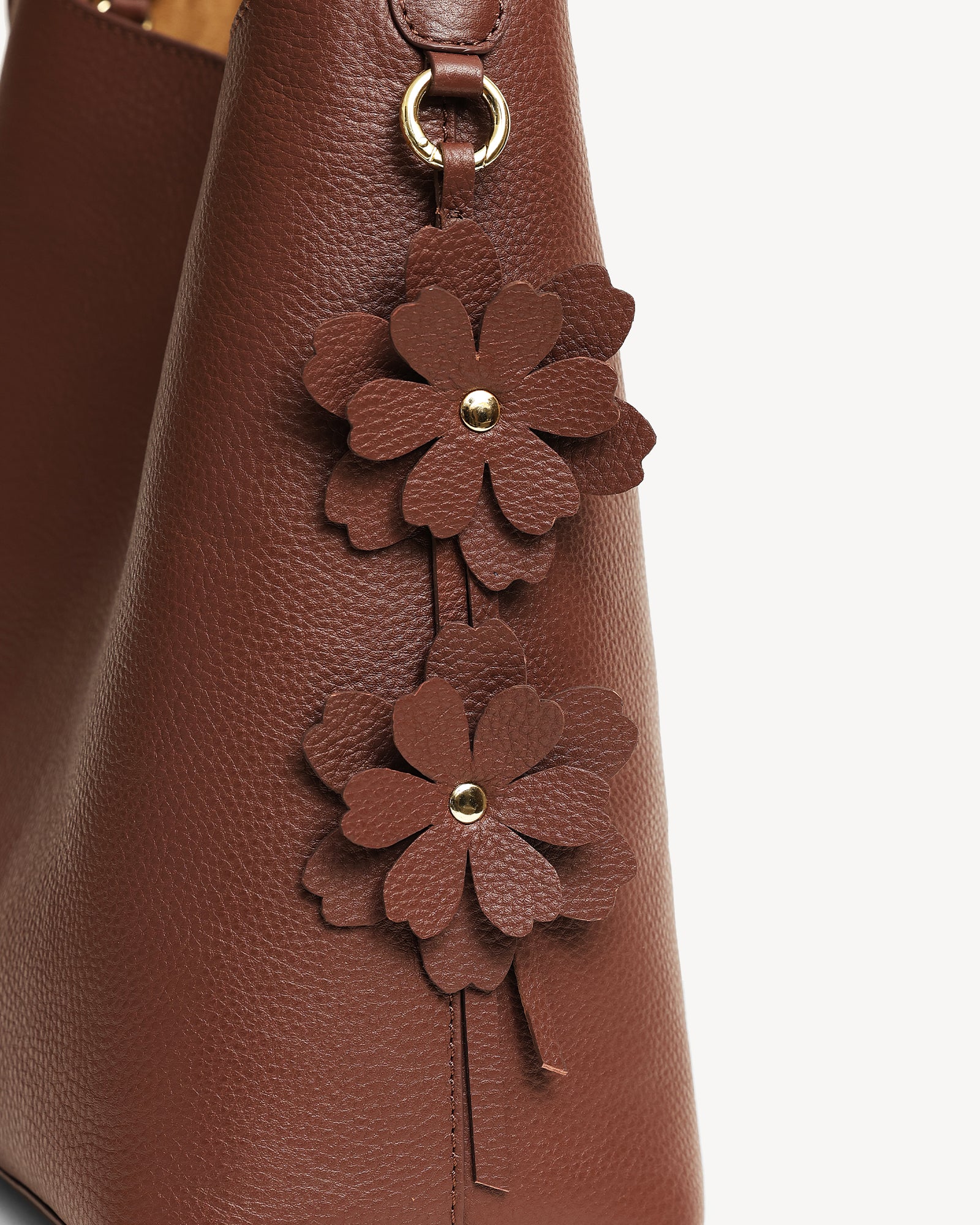Made from soft, full-grain leather with a rich pebbled texture, this bag blends timeless style with everyday ease. Its classic shape moves effortlessly from work to evening, while a suede-lined interior and light-gold accents add subtle luxury. Finished with a delicate flower charm and an adjustable strap, it’s designed to keep up with your day in quietly confident style.