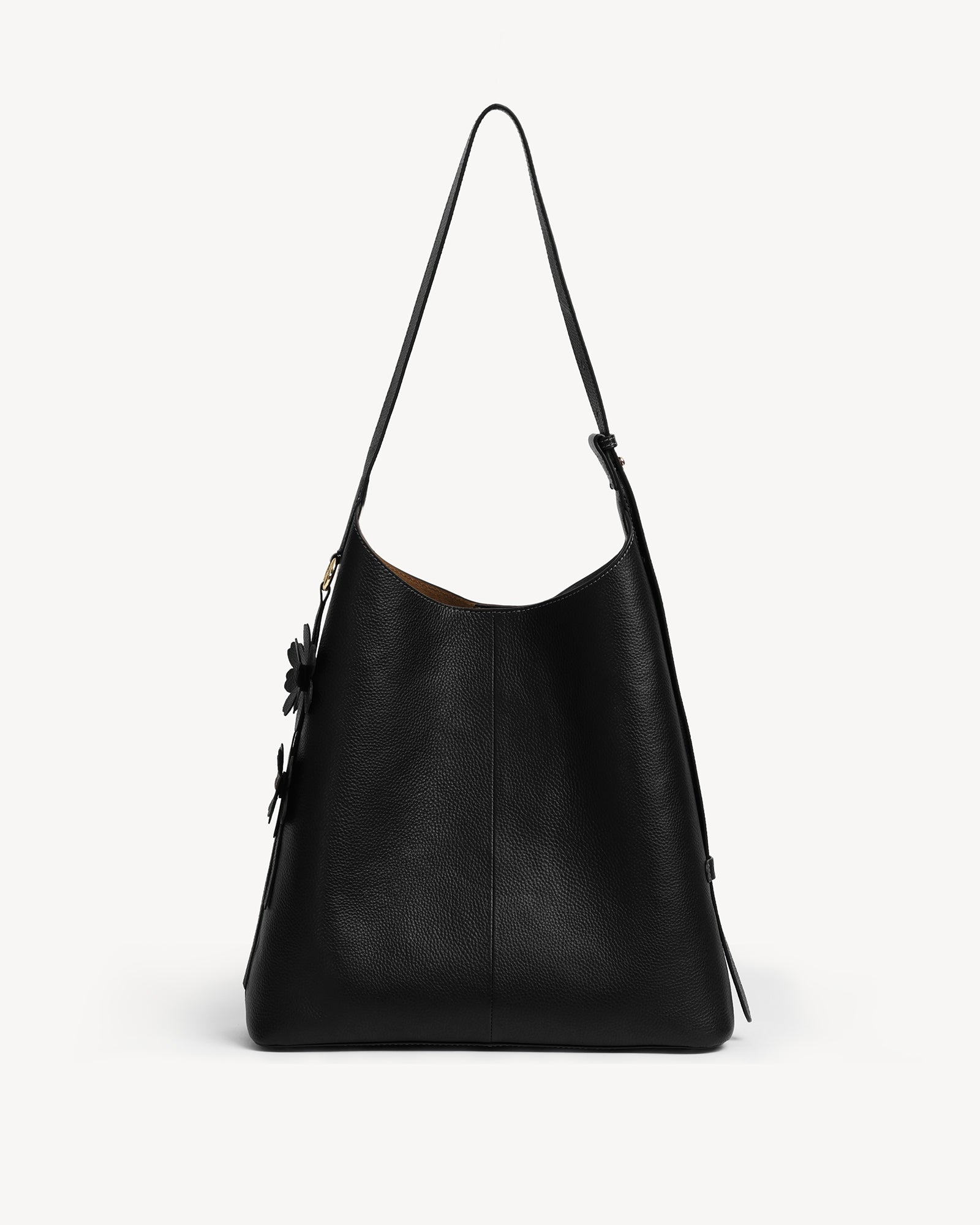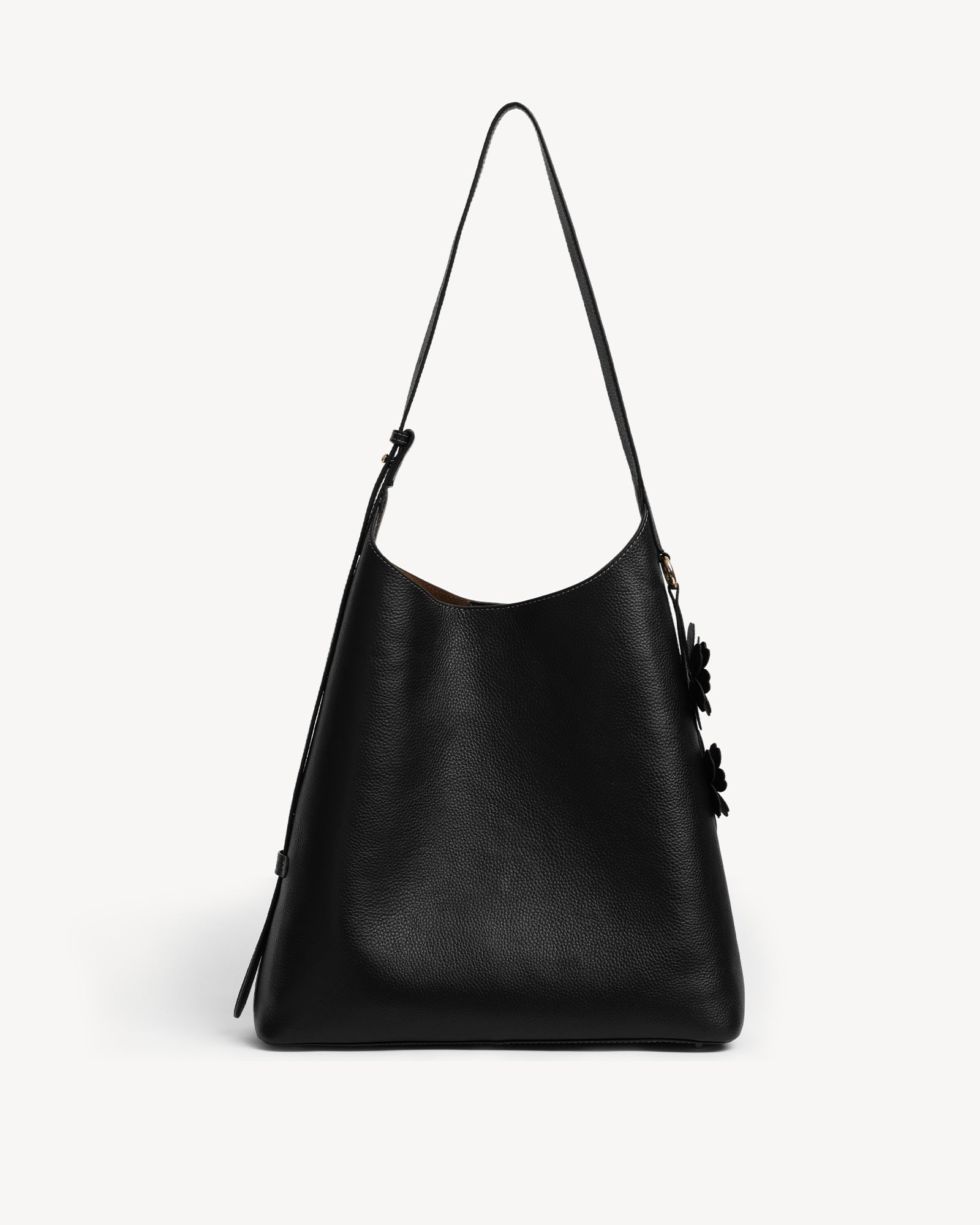 Crafted from full-grain leather with a rich pebbled texture, this bag pairs everyday function with understated luxury. A suede-lined interior, polished light gold hardware, and a magnetic closure keep your essentials secure, while the spacious main compartment fits a 13" laptop with ease. A detachable utility pouch organizes smaller items, and the adjustable strap ensures all-day comfort. Finished with a delicate flower charm, it’s ready to move with you from work to play.