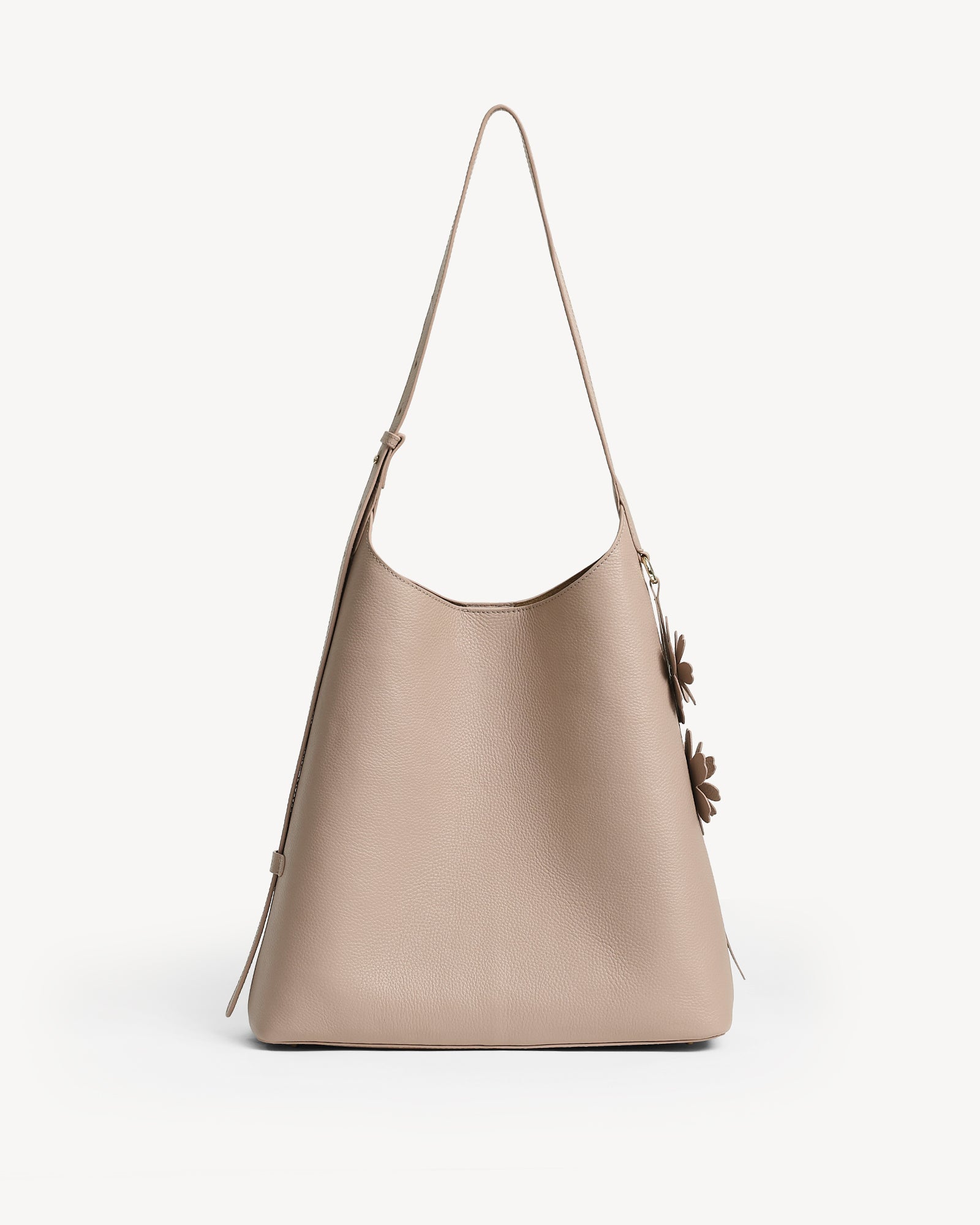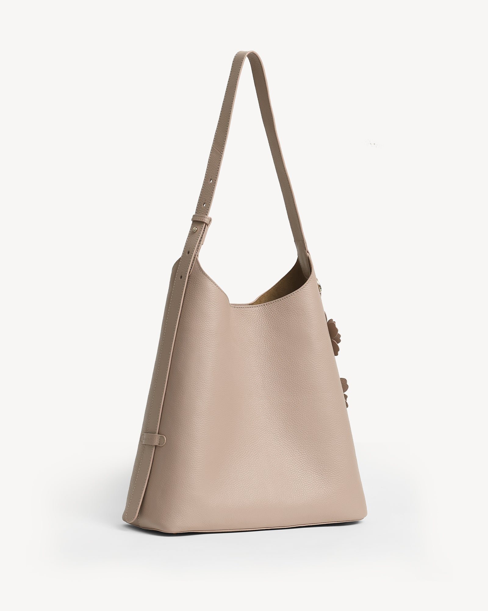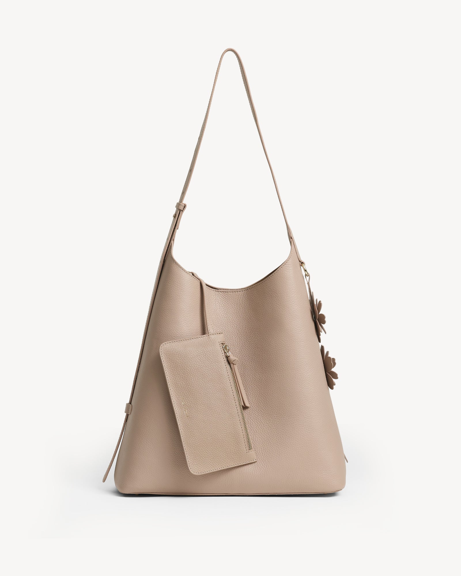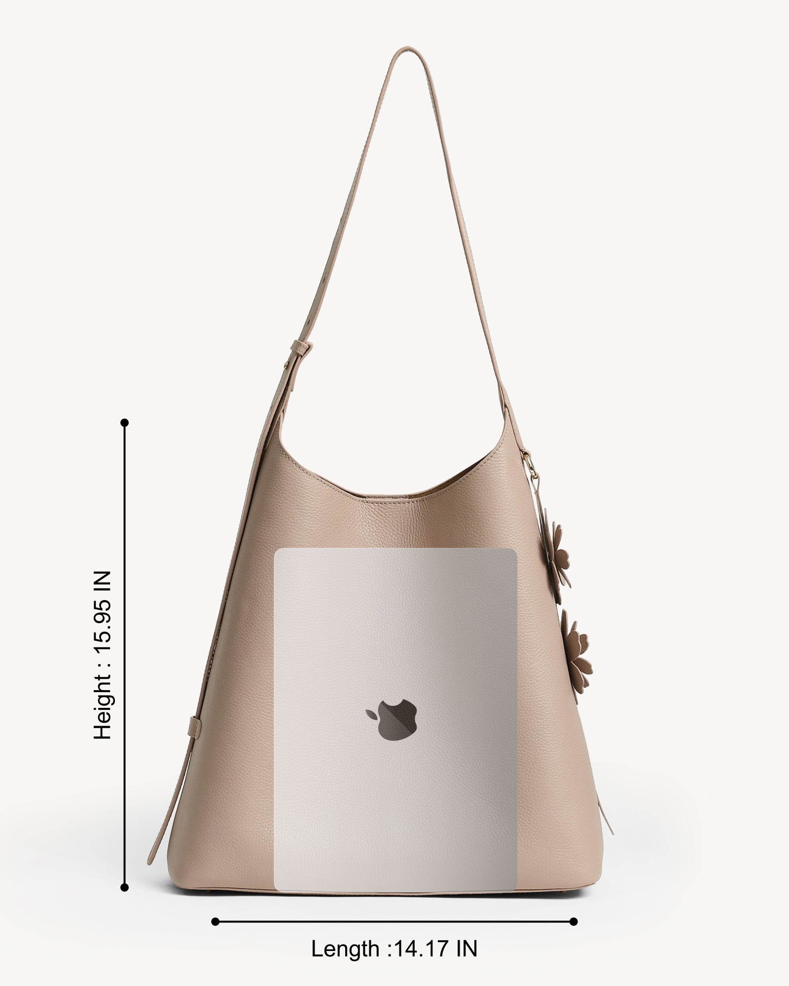 Crafted from full-grain leather with a rich pebbled texture, this bag pairs everyday function with understated luxury. A suede-lined interior, polished light gold hardware, and a magnetic closure keep your essentials secure, while the spacious main compartment fits a 14" laptop with ease. A detachable utility pouch organizes smaller items, and the adjustable strap ensures all-day comfort. Finished with a delicate flower charm, it’s ready to move with you from work to play.
