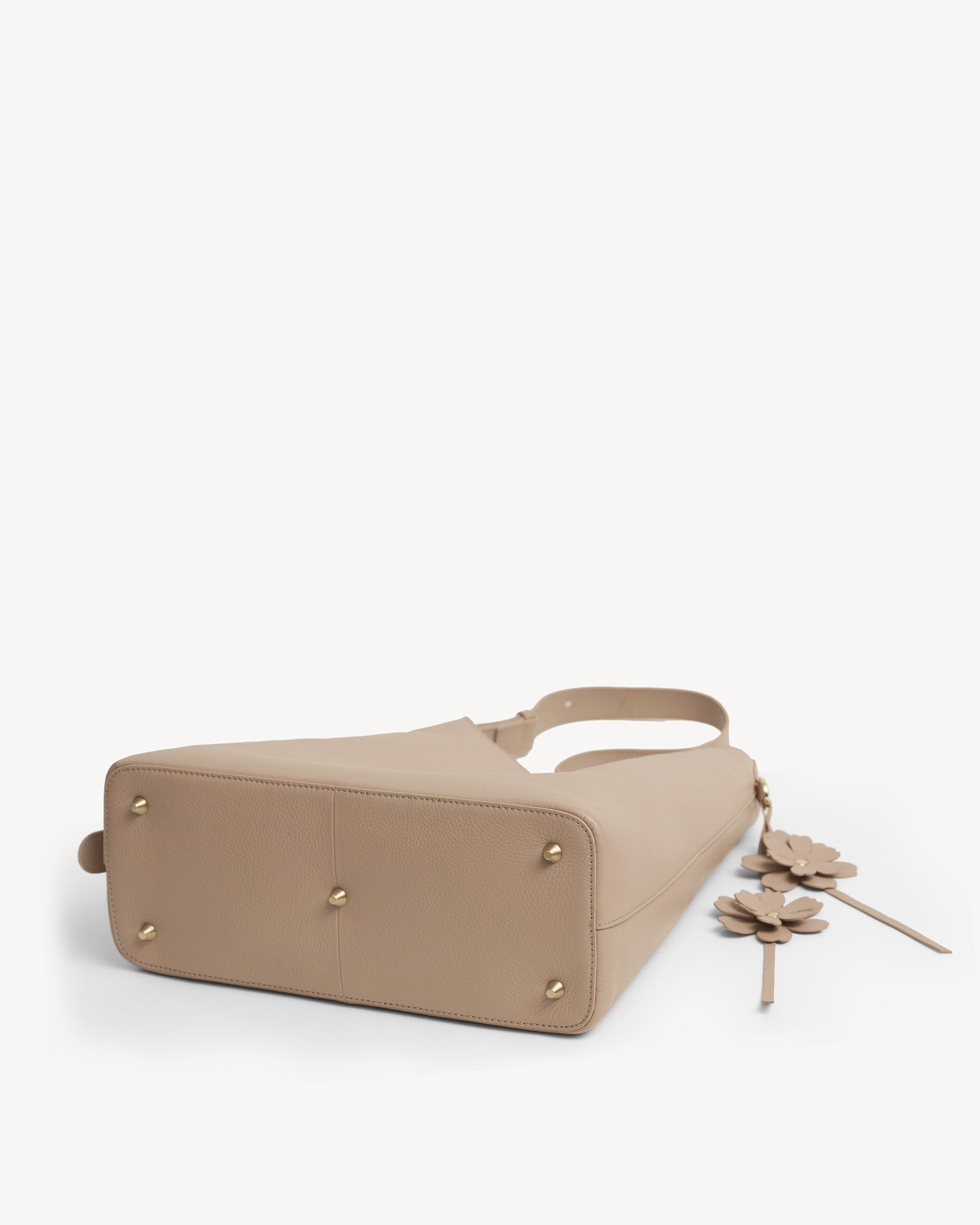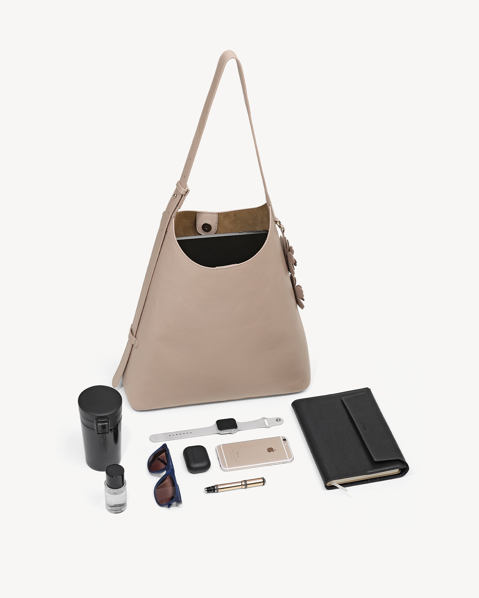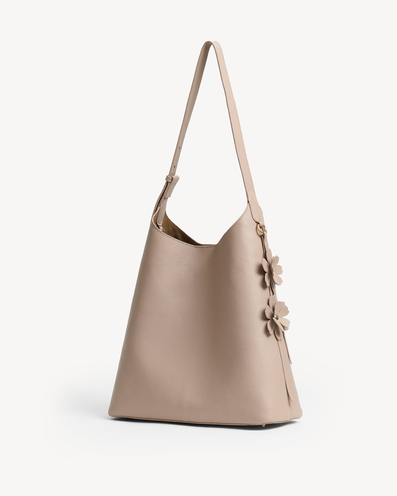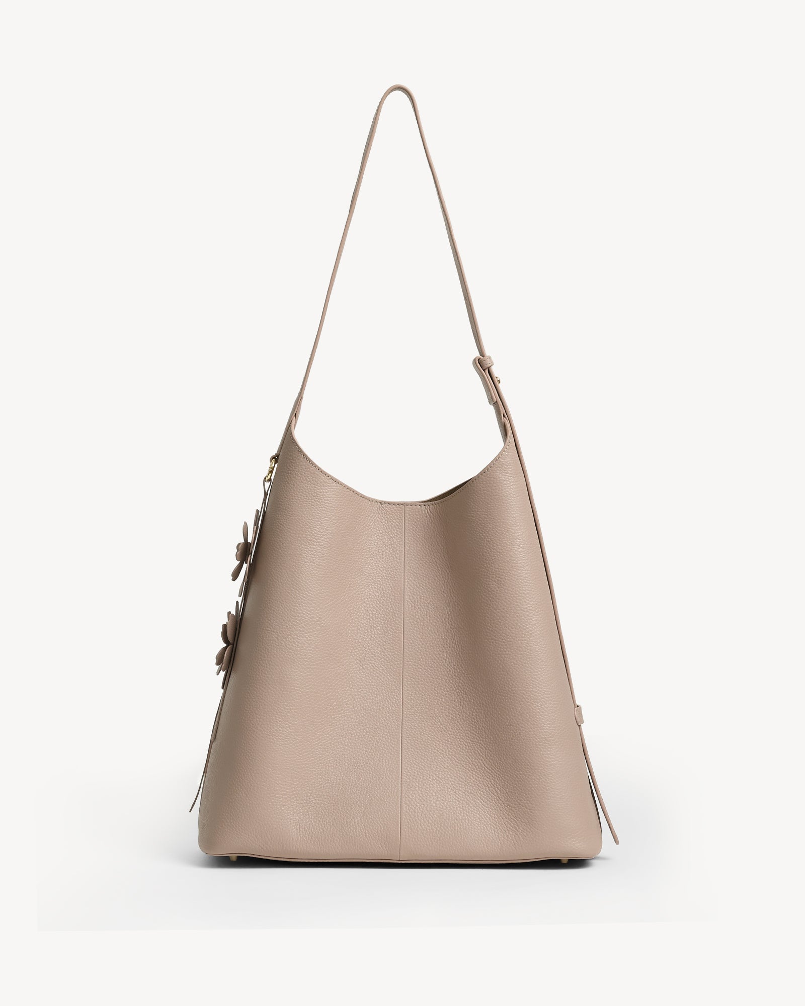 Crafted from full-grain leather with a rich pebbled texture, this bag pairs everyday function with understated luxury. A suede-lined interior, polished light gold hardware, and a magnetic closure keep your essentials secure, while the spacious main compartment fits a 14" laptop with ease. A detachable utility pouch organizes smaller items, and the adjustable strap ensures all-day comfort. Finished with a delicate flower charm, it’s ready to move with you from work to play.