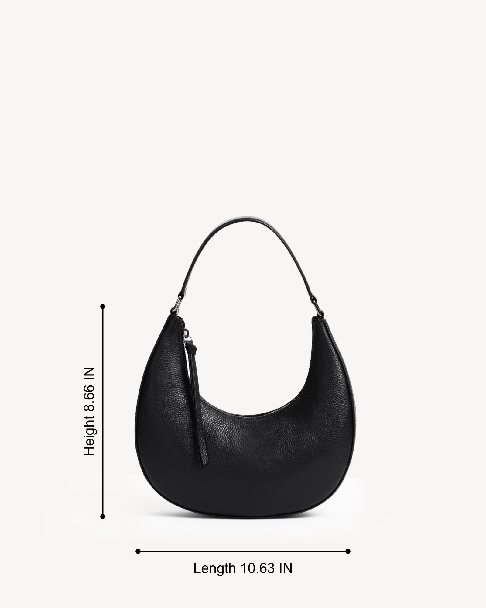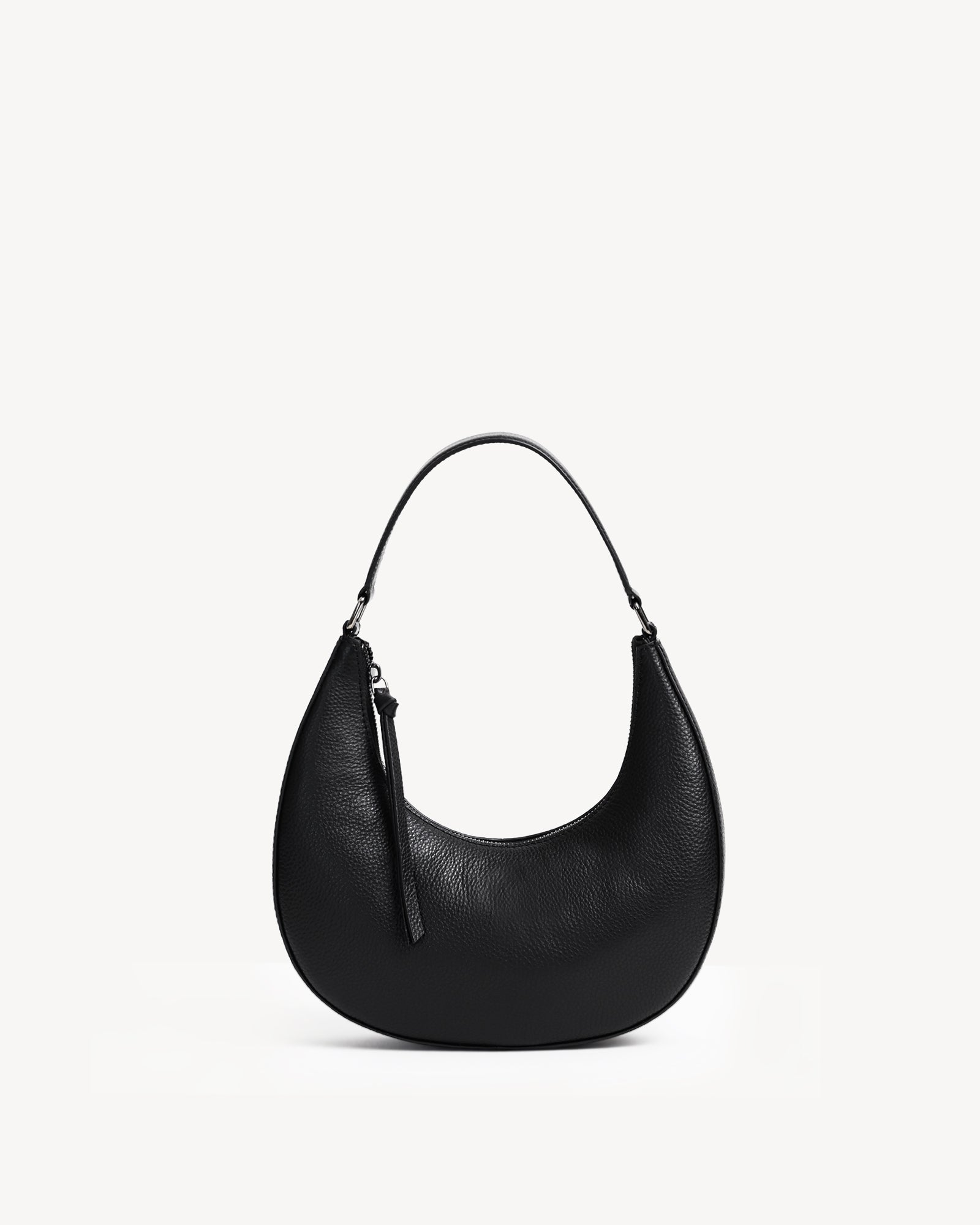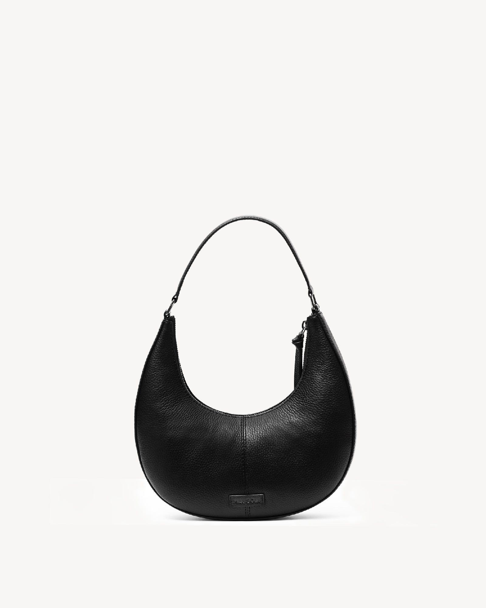 Crafted from premium full-grain pebbled leather, this moon-shaped bag features sleek gunmetal hardware and smooth leather zipper pullers. The sculpted top handle and refined silhouette offer just the right amount of space for your essentials, blending form and function in an understated, contemporary design.