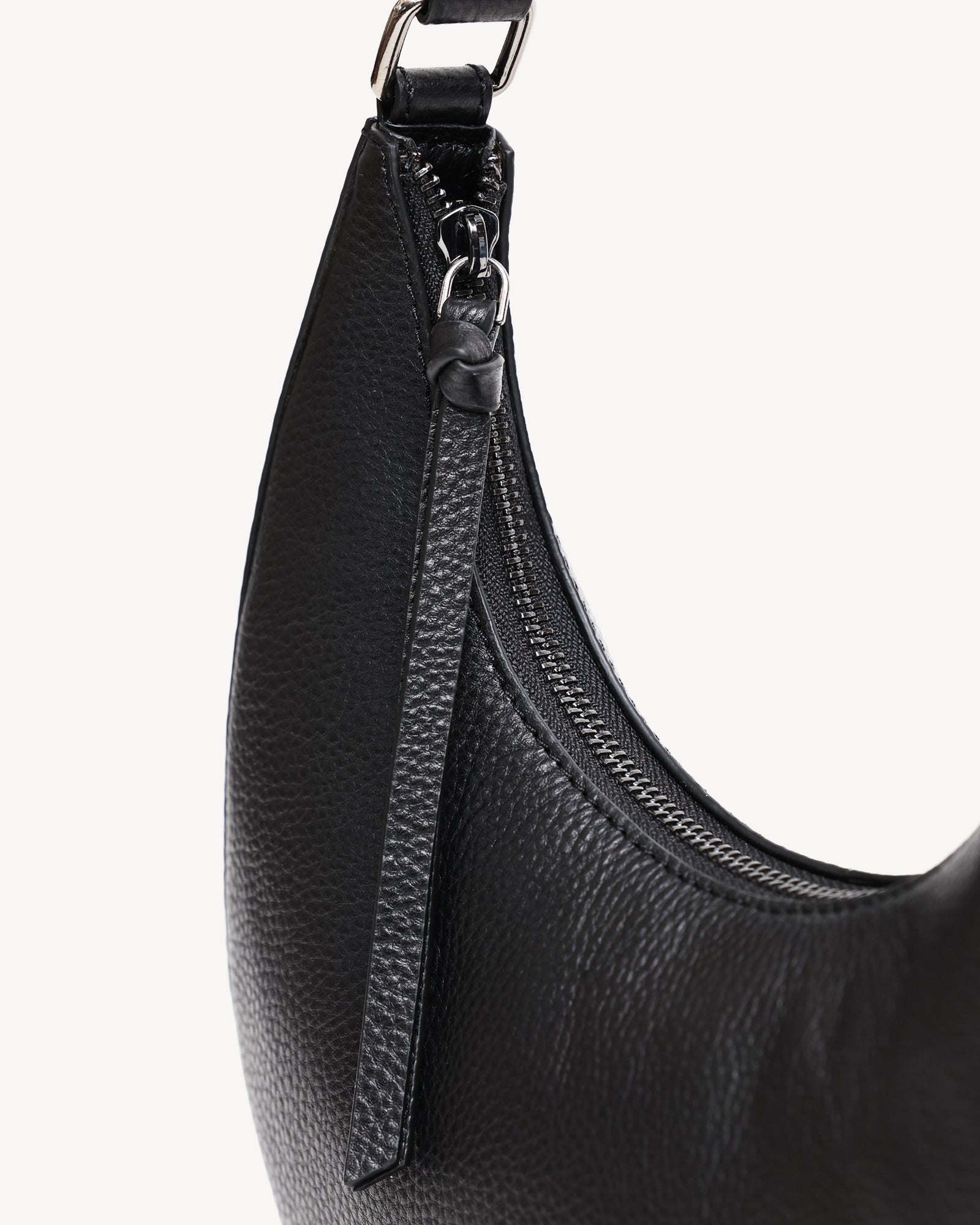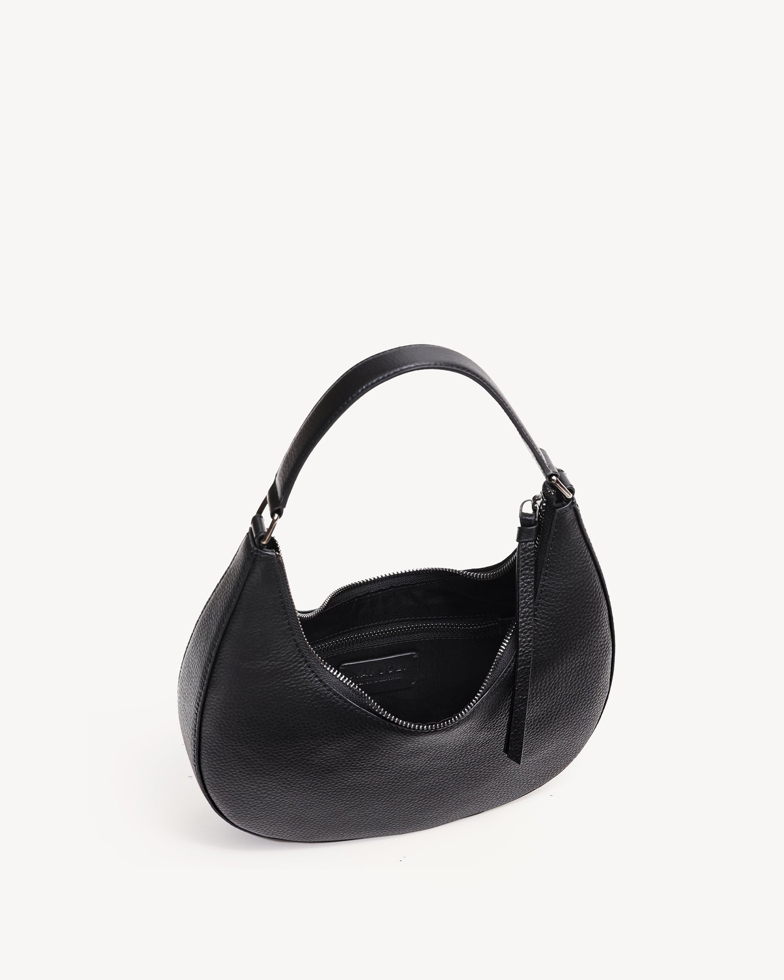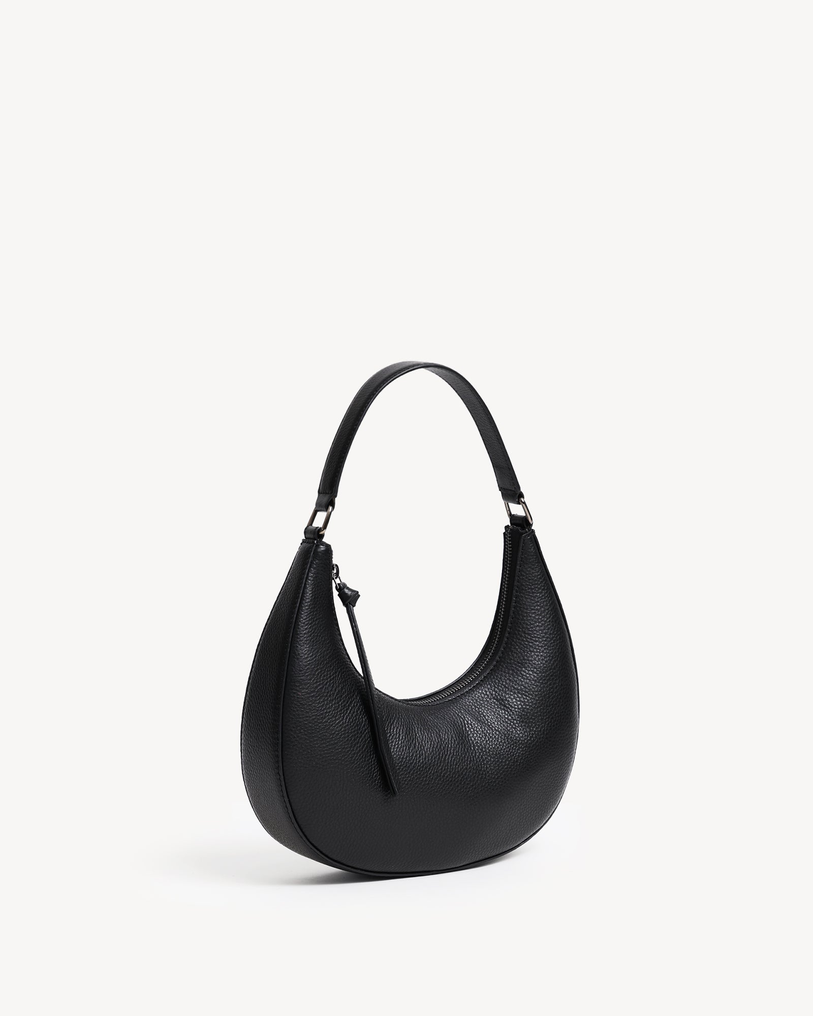 Crafted from premium full-grain pebbled leather, this moon-shaped bag features sleek gunmetal hardware and smooth leather zipper pullers. The sculpted top handle and refined silhouette offer just the right amount of space for your essentials, blending form and function in an understated, contemporary design.