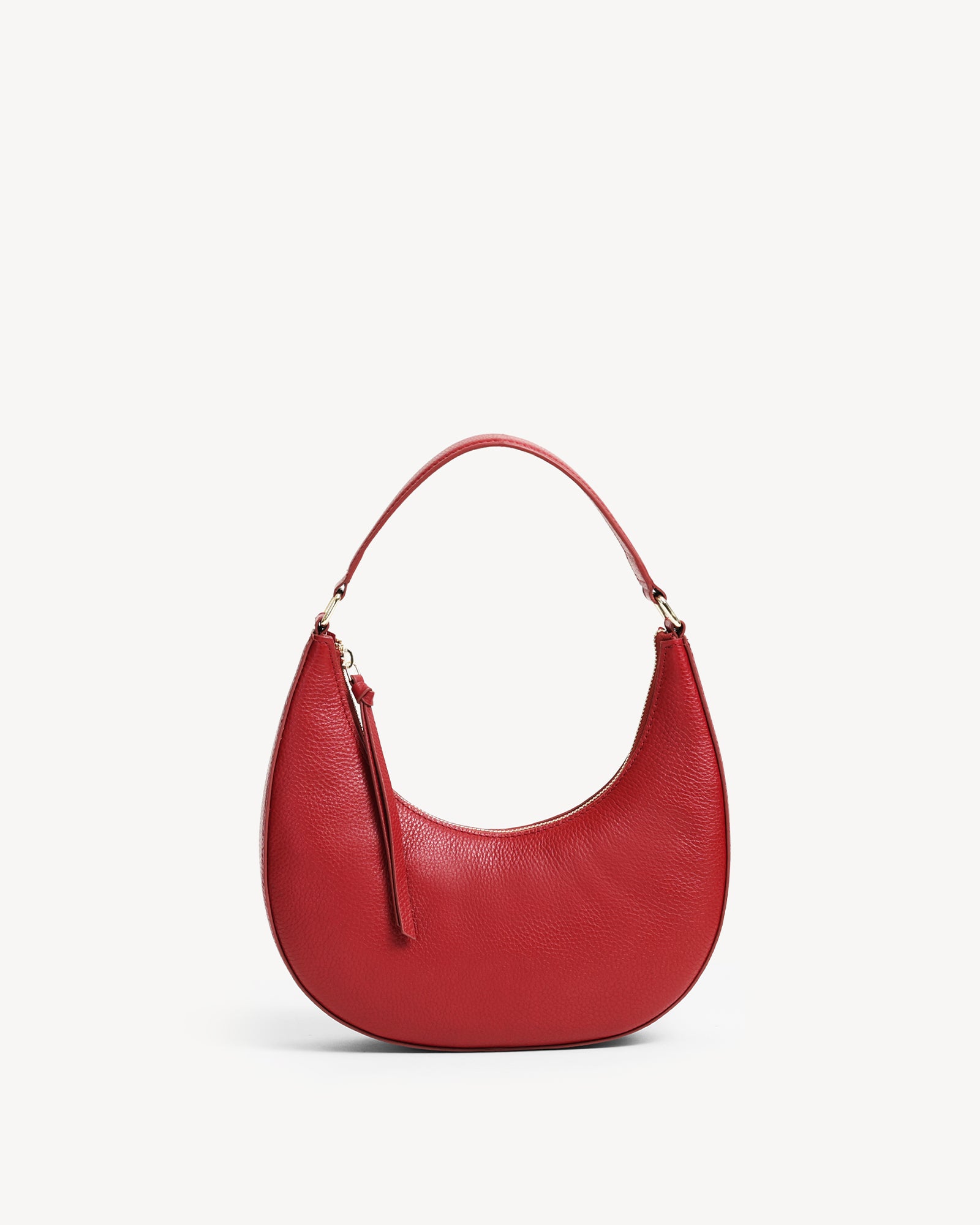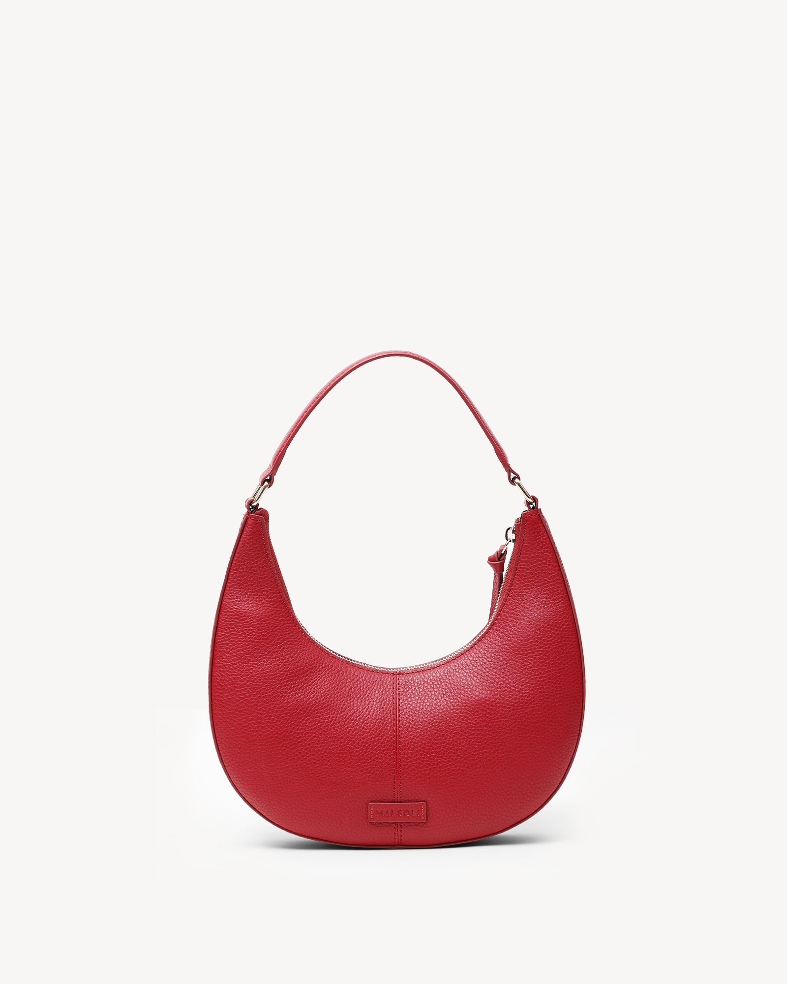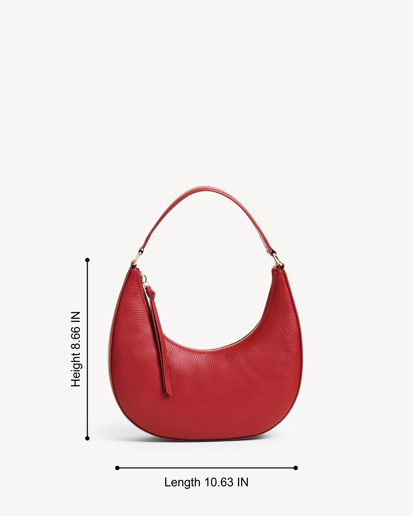 Crafted from premium full-grain pebbled leather, this moon-shaped bag features warm light gold hardware and smooth leather zipper pullers. The sculpted top handle and refined silhouette offer just the right amount of space for your essentials, blending form and function in an understated, contemporary design.