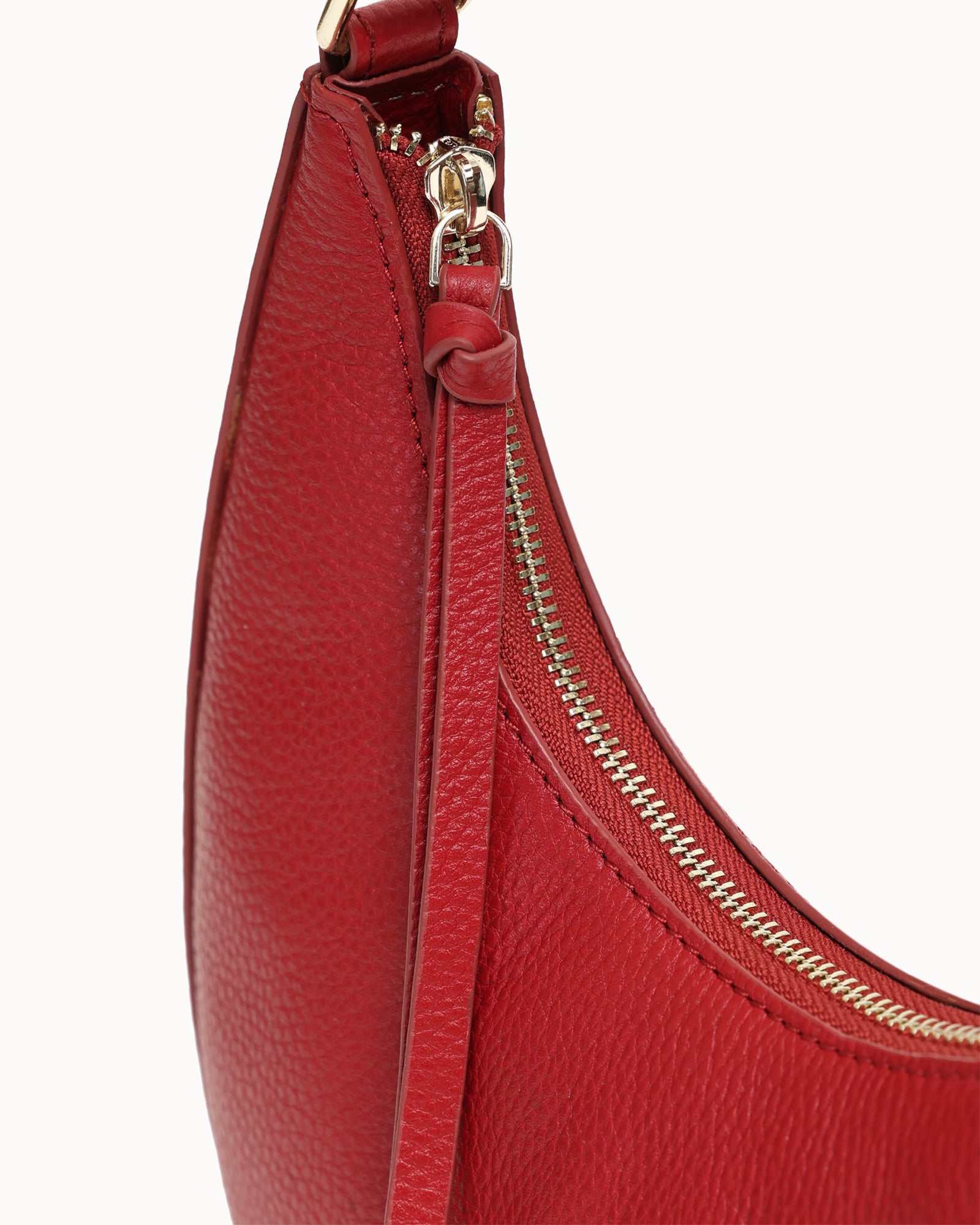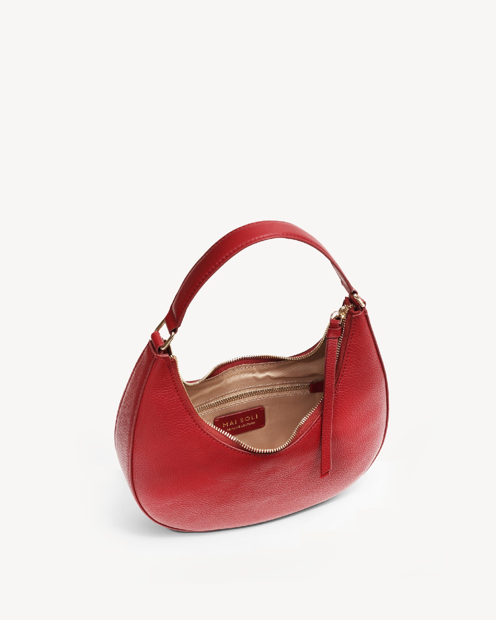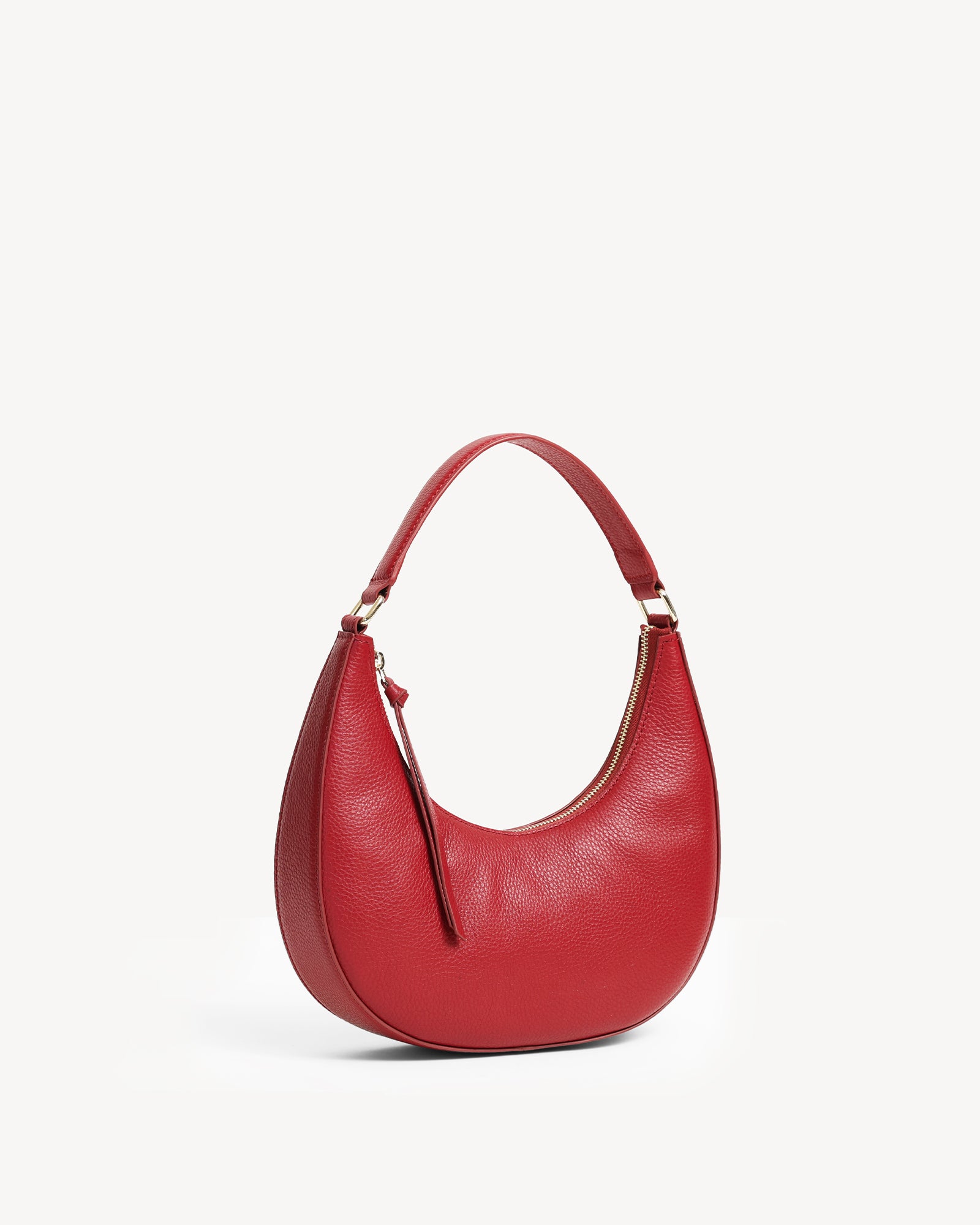 Crafted from premium full-grain pebbled leather, this moon-shaped bag features warm light gold hardware and smooth leather zipper pullers. The sculpted top handle and refined silhouette offer just the right amount of space for your essentials, blending form and function in an understated, contemporary design.