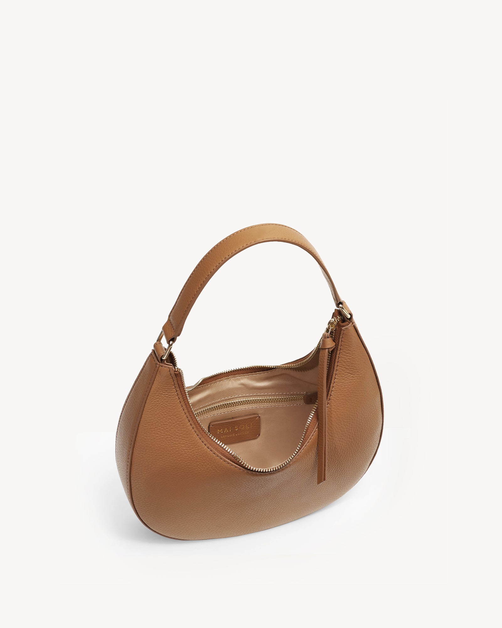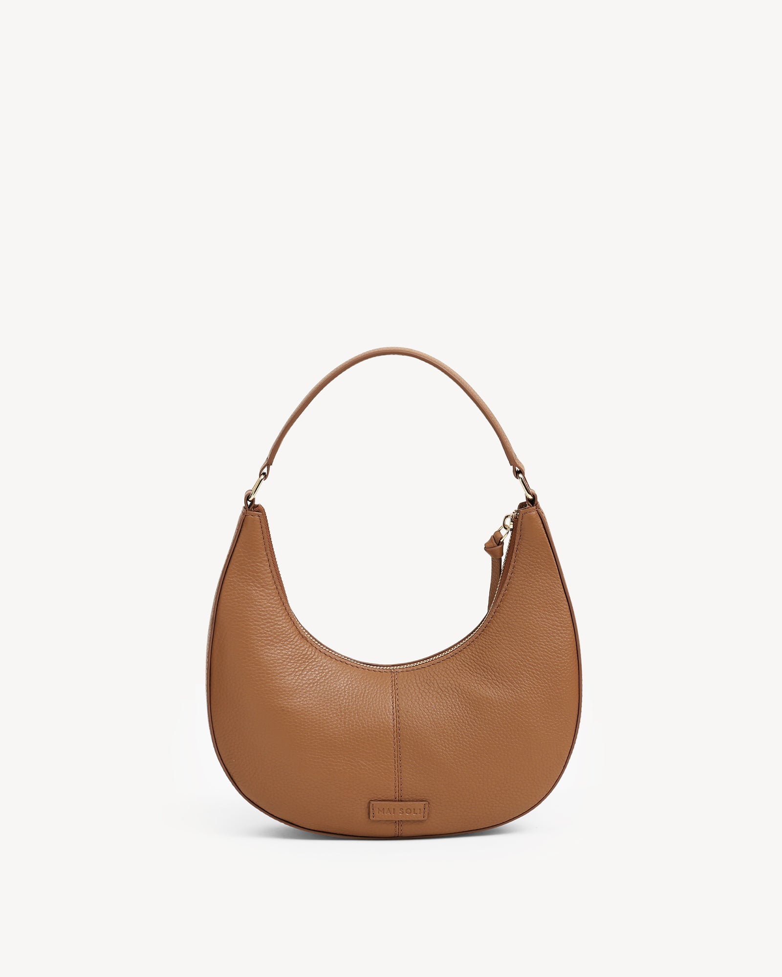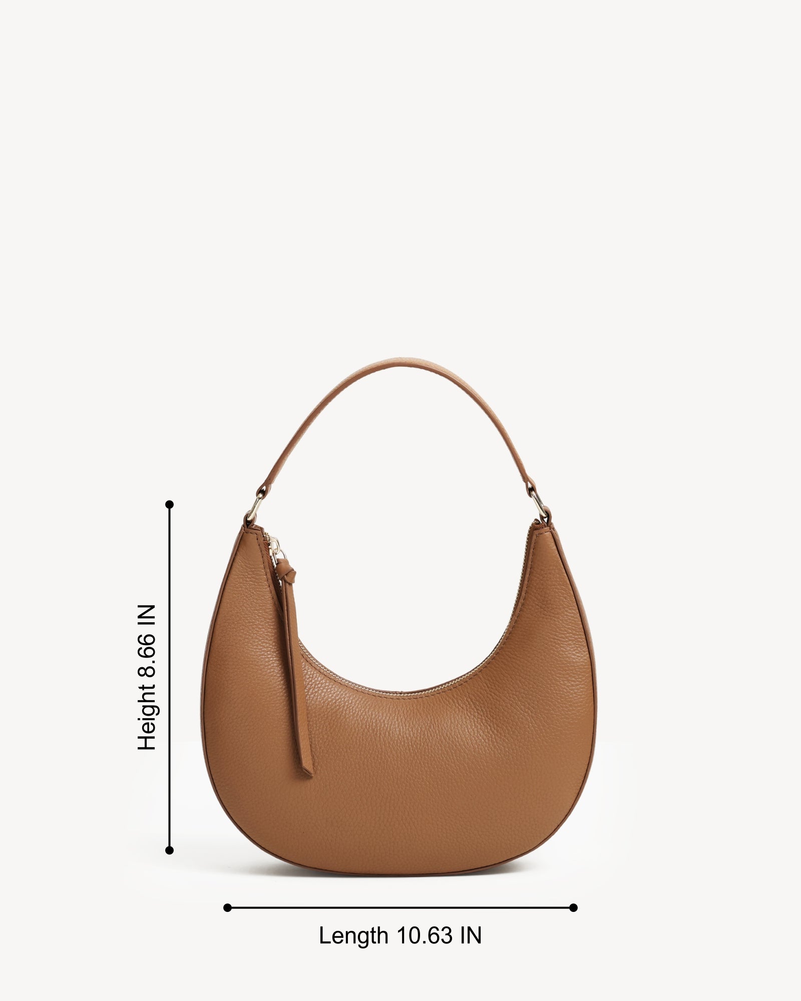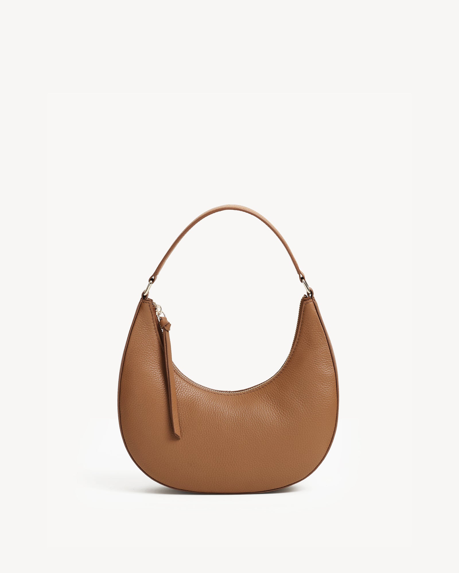 Crafted from premium full-grain pebbled leather, this moon-shaped bag features warm light gold hardware and smooth leather zipper pullers. The sculpted top handle and refined silhouette offer just the right amount of space for your essentials, blending form and function in an understated, contemporary design.