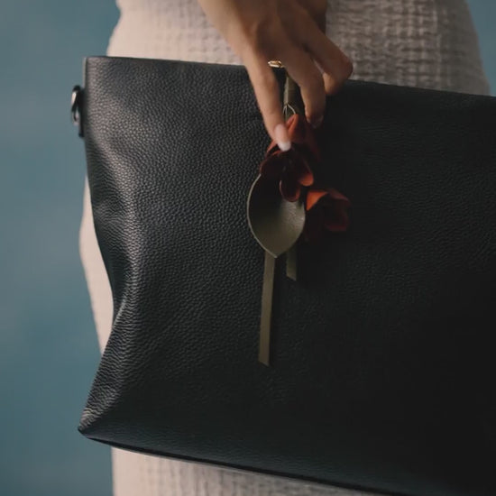 Your everyday bag, reimagined. Crafted from full-grain pebbled leather and finished with sleek gunmetal hardware, it balances timeless elegance with effortless utility. Supple leather zipper pullers and a smooth top zip secure a spacious main compartment, designed to fit up to a 15" laptop with ease. Inside, a zip pocket safeguards your valuables, while a slip pocket keeps essentials close at hand. Carry it by the structured leather shoulder handle for a polished look. Finished with a subtle leather flower charm, to elevate your personal style.