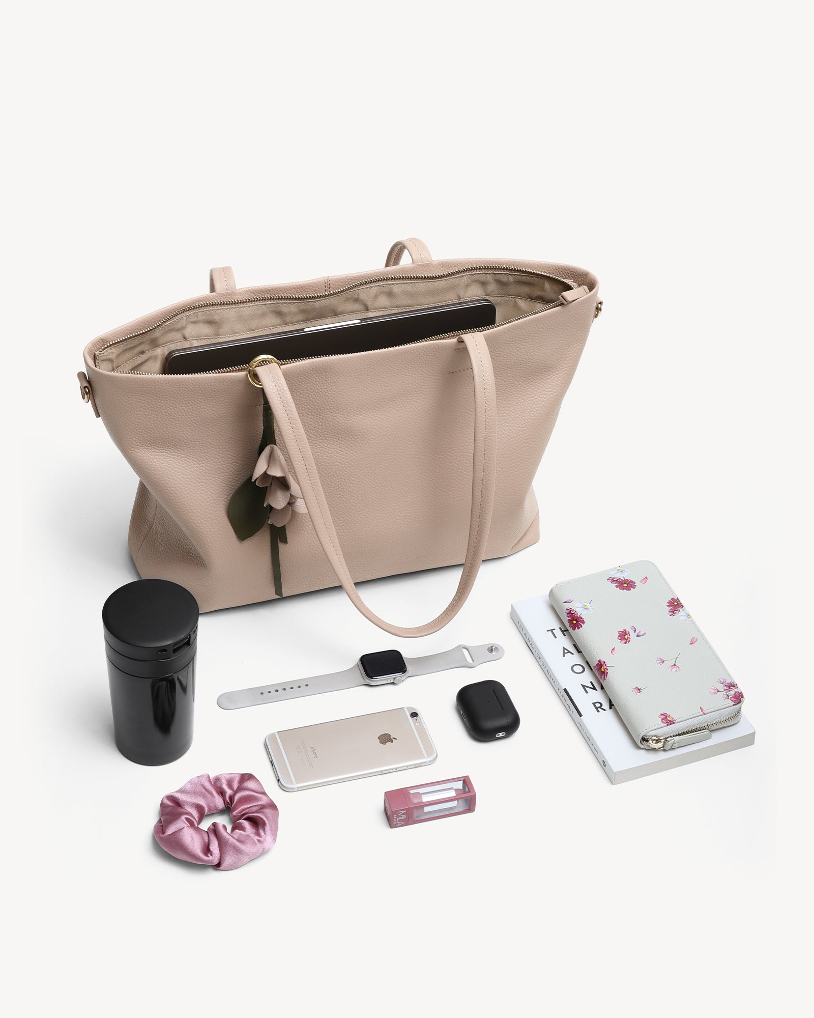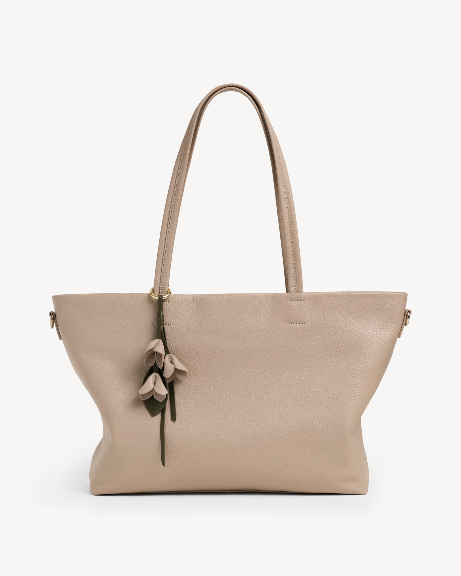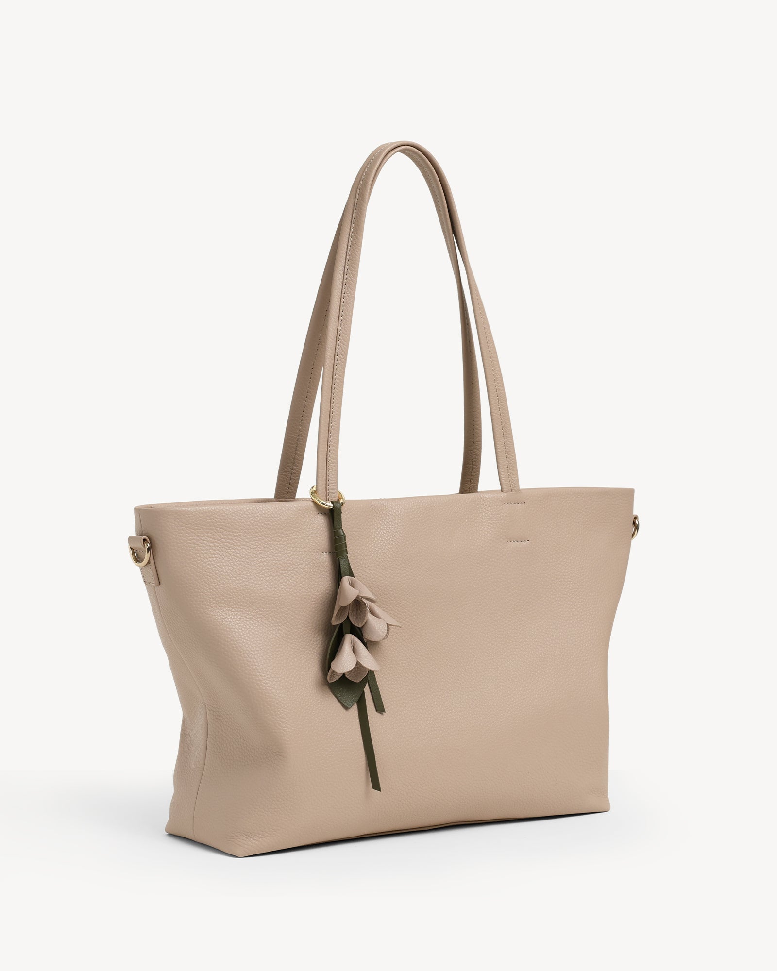 Your everyday bag, reimagined. Crafted from full-grain pebbled leather and finished with warm light gold hardware, it balances timeless elegance with effortless utility. Supple leather zipper pullers and a smooth top zip secure a spacious main compartment, designed to fit up to a 15" laptop with ease. Inside, a zip pocket safeguards your valuables, while a slip pocket keeps essentials close at hand. Carry it by the structured leather shoulder handle for a polished look. Finished with a subtle leather flower charm, to elevate your personal style.