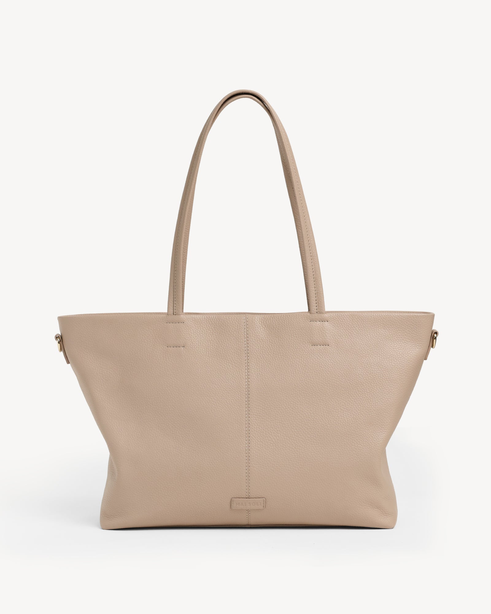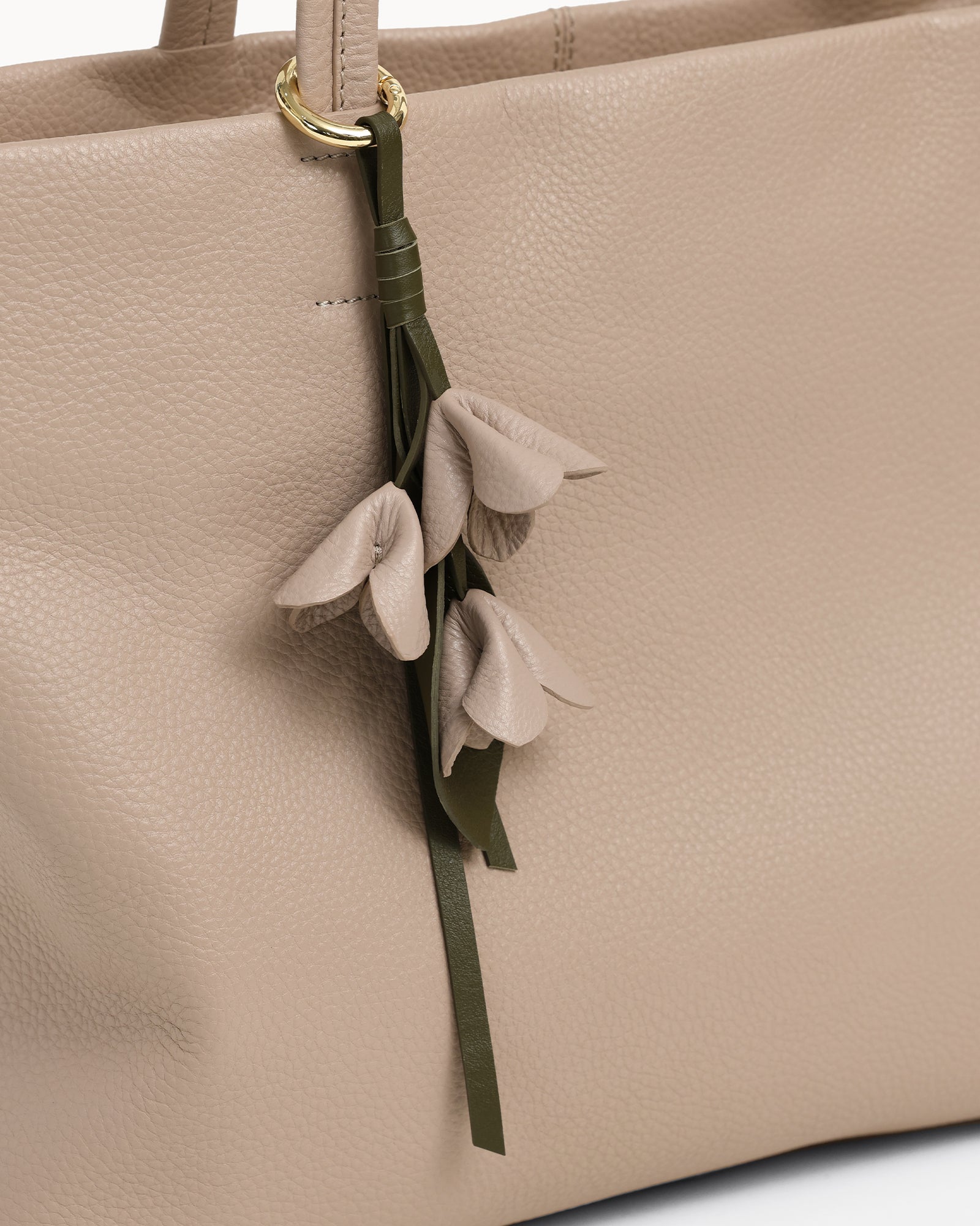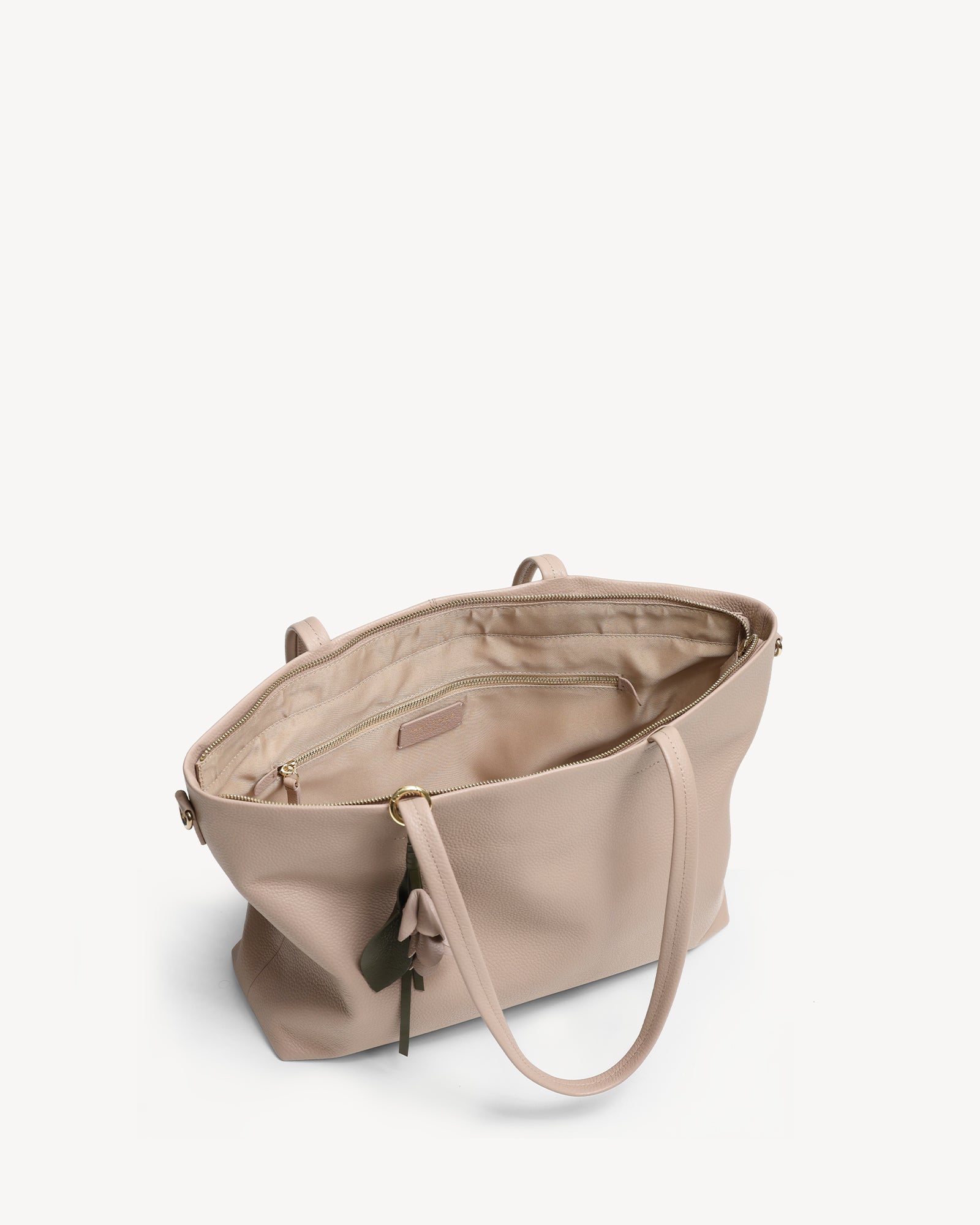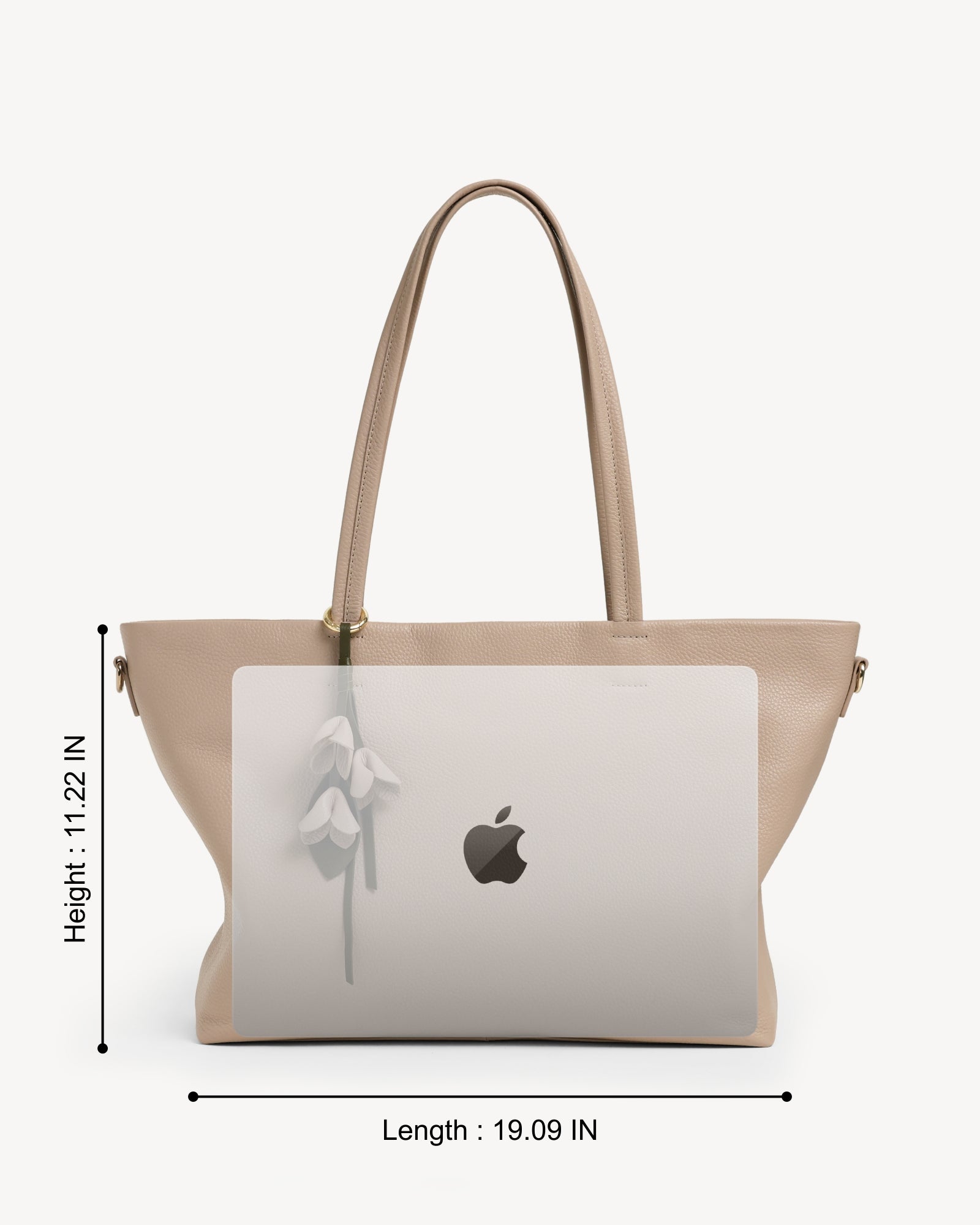 Your everyday bag, reimagined. Crafted from full-grain pebbled leather and finished with warm light gold hardware, it balances timeless elegance with effortless utility. Supple leather zipper pullers and a smooth top zip secure a spacious main compartment, designed to fit up to a 15" laptop with ease. Inside, a zip pocket safeguards your valuables, while a slip pocket keeps essentials close at hand. Carry it by the structured leather shoulder handle for a polished look. Finished with a subtle leather flower charm, to elevate your personal style.