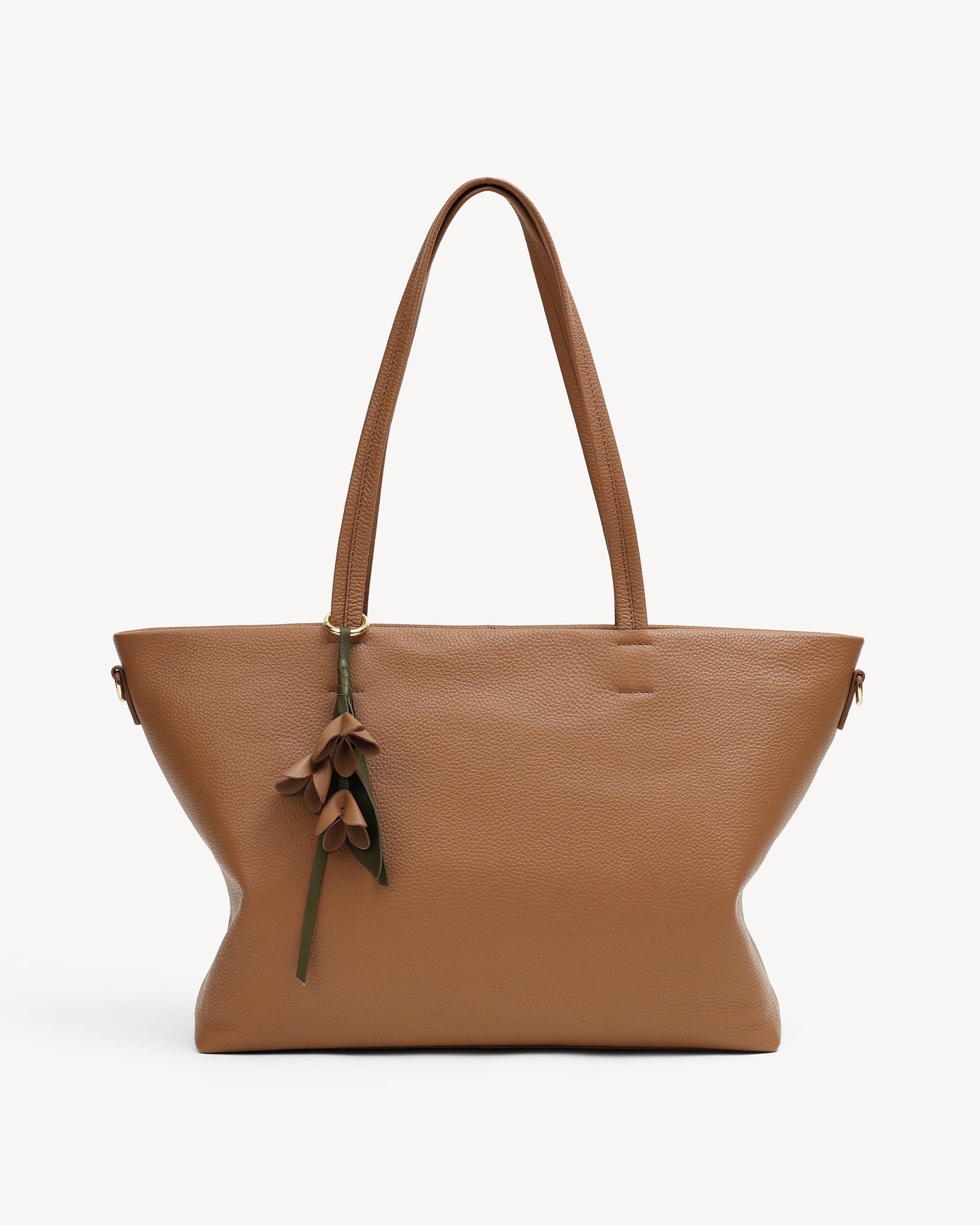 Your everyday bag, reimagined. Crafted from full-grain pebbled leather and finished with warm light gold hardware, it balances timeless elegance with effortless utility. Supple leather zipper pullers and a smooth top zip secure a spacious main compartment, designed to fit up to a 15" laptop with ease. Inside, a zip pocket safeguards your valuables, while a slip pocket keeps essentials close at hand. Carry it by the structured leather shoulder handle for a polished look. Finished with a subtle leather flower charm, to elevate your personal style.